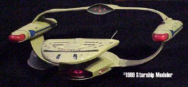 Background The Leyte Gulf class cruiser was constructed with common components to both the Galaxy and Nebula class cruisers. This was seen as logical due to the interchangeability of components between the ship classes, and also so that personnel trained to operate one class of ship could easily adapt to the others. When the Leyte Gulf was being designed, there was discord among the top brass at Starfleet as to whether it should primarly be a scientific vessel or a combat vessel. This discord existed as a result of the Borg incursion, and strained relations with the Cardassian Empire. The design of the Leyte Gulf was one that pleased both sides - the upper pod could be used to house any combination of sensors of weapons, and hardware in the pod could be swapped out at any starbase. It also employs separable saucer and drive sections, which not only keep non-combatants safe in times of trouble but also increase the offensive capabilites of the drive section. It was also fitted with high dissipation shileds to increase its defensive capabilities. Construction Details This model uses the saucer section and warp nacelles from an Enterprise-D model. It laso uses components of the secondary hull, although they have been heavily modified. The model is lighted, and the saucer section can be detached from the drive section (the saucer only lights up when attached to the drive section). |
