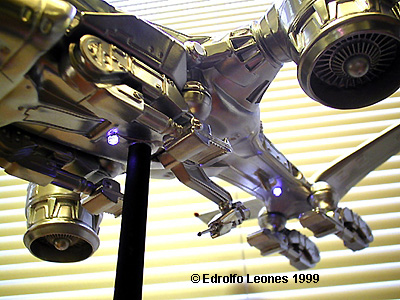 This is the vinyl model kit that is well over 14" long from Screamin' Models. The original design is relatively simple yet elegant and makes it one my favorite space ships even though it had only a few shots in Terminator 2. There are at least five coats of chrome spray paint along with blue LED strobes on its underside and two white LEDs for its search lights. I experimented with just about every type of silver paint on the market and was about 1 decision close to going as far as recasting the parts myself in resin and then using a new home chrome-plating process I came across This "Electroless Chrome" kit requires you to dip the piece in a stove-top boiling solution which would have made the vinyl melt and deform. I may use the product for a future project that can handle the high temperature. I finally found the best and least expensive solution using Krylon Chrome spray paint. I had to prime coat the vinyl model to keep the Krylon spray from eating the plastic. After about 5 or 6 layers, it gave off a pretty good quality metal finish as you can see by the photos. I still wish, however that I could have chromed the kit... >sigh<. You can see more of Edrolfo's work at his home page. |