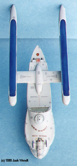 I did this ship after seeing the Dominion War contestants. I really liked the "Wanda Diane" entry for it's clean design, but with some changes. I figured a warship ( I mean it does have 4 forward photon tubes) ought to have a larger shuttle for transporting troops etc. THe model is basically a straight kit bash; the additions are corrugated Evergreen sheet for one of the 2 large shuttle bay doors. Plastic pipette is the main part of the big shuttle attached to the froward section. The command area of this