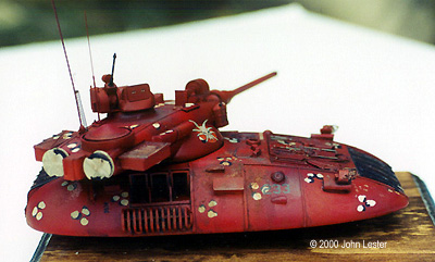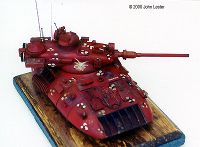 First off was the gun, a huge howitzer tuge with manly muzzle brake and hefty gas extractor. I lopped that off and replaced with a more futuristic (to me, anyway) railgun made from square brass stock. The rear commander's hatch on the turret got a small "coolie hat" shape cast from some bottle top I found. It represents a sensor of some sort. The other hatch got a modified gun turret taken from the Tamiya 1/35 M60A2 kit. Antennas were made from steel wire and a spring I found on the ground in the Wal-Mart parking lot. The lights got brush guards made from brass wire and the intakes were covered with window screen, framed with strips of styrene. I was going for a "Martian" paint scheme, which I decided looked like my old desert utilities (the "chocolate chip" pattern from the Gulf War) - except redder. The base color is some Krylon rust preventative, with alternating bands of Gunze "Red Madder" sprayed over. The chips are the bare resin, masked off with liquid mask, and accentuated with black shadows using a Sharpie marker. After a coat of clear flat, I added "wire" to the two spools on the back of the turret. Decals were from the spares box. I'm not entirely happy with how the paint scheme turned out - too "chippy". After a contest judge remarked the model was "too glossy" (like how would he know? Maybe the tank is made from Gundanium, dang it!), I attacked it with Rustall - and what a difference that made in the finish. Now it looks beat to heck. I also added a gouge from a near miss. All-in-all - a good model that was a blast to paint.Image: Front view Image: Another perspective |