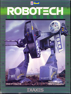 DC Comics' three-part miniseries was so bad it folded after just two issues. The model kit line, however, was more successfull. Revell imported and re-boxed a number of models from Japanese Macross, Dougram and Orguss lines, giving them new names. Many of these designs later migrated to the Battletech tabletop wargames. Revell's Exaxes was one of these kits. Originally the Ishforn from Studio Nue's Super Dimension Century Orguss anime (one of three Super Dimension Century series, the others being Super Dimensional Fortress Macross and Super Dimension Cavalry Southern Cross, both of which would be blended into the English-language Robotech cartoon), it was a 2-man, lightly armed, reconnaissance mech specially configured for rough terrain. The kit was first released by Arii, and the sprues are still stamped with the Orguss series name and Arii's logo. The copyright on Revell's instructions is 1985. What You Get I bought won this kit in an eBay (US) auction for about $30 (2003) - though they can be found for both less and more, depending on condition and whether anyone else out there wants one the same time as you. (Sometimes you can find this kit, or its Arii boxing, in online retailers of pop-culture or Japanese toys, as well. Locating a model like this is often half the fun.) |