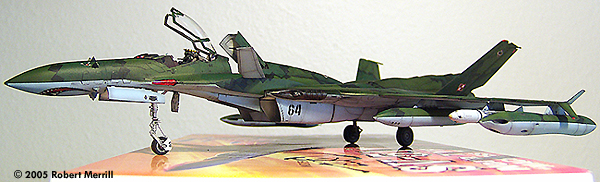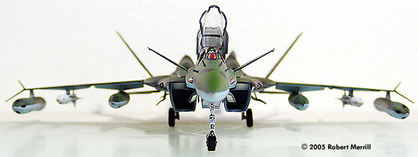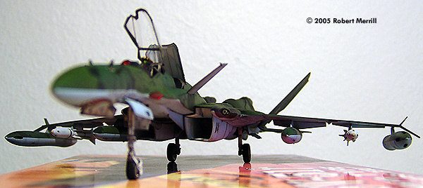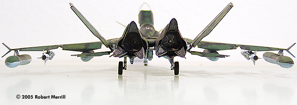 Final Assembly Finally, paint & decaling done, it was time to assemble. Fitting the leg/engines to the body posed little problem. I ended up not being able to glue the large gun into place as the fit between it and the legs are tight enough that it wasn't needed. The guns next to the intake had some small fit issues but trimming the mounting pegs a bit solved that. I also noticed that the insides of the gun mounts were unpainted. So much for my critical analyses of the plans to paint everything. Placing the exhaust/feet in place has some issues. The exhaust units have these little tab/spring things that need to fit into slots in the base. My guess is you have the choice of positioning the feathers in or out. Not the best system. It takes some careful fitting and wiggling to get everything in place. The wings came next. The left wing fit in easily, little bit of Tennax & some pressure and bamf! No seam. This, of course, meant the right wing was going to be an utter pain. And I wasn't entirely wrong. The dry fit looked good but when I adjusted the camber to match the left wing some gappage was revealed. Tried a bit of filing but I still had issues. Finally I gave up and made the best of it, figuring to try fixing the it at a later date. Tail surfaces went together fine but revealed some unpainted areas. Some touch-up solved that. Landing gear went in without any problems. I did wait until last to glue the front landing gear lights in place. Speaking of clear parts, I do wish that somebody would develop a more positive mounting system for the cockpit canopy. My best method is to glop on some Testor's Clear Parts glue and hope. Anyways, back to assembly. The only tricky parts left were the landing gear bay doors & the under-wing ordinance. With the exception of the two doors (I managed to break one of the mounting tabs off) everything went on fine. For some reason the big missile pods on the wing tips didn't want to settle down unless I trimmed off the mounting pins. Once I trimmed them off they went on well. Then suddenly it was done. Wow, cool. Then, in the midst of taking pictures I realized I hadn't put the front landing gear lights on. Now I was done. Finally. Conclusion In the end, I think this is one wicked looking aircraft. Assembly is well thought out and the fit rather good. The lack of detail in the landing gear bays is forgivable but I really wish they'd added in. Next time I may replace the position lights with little clear bits and trim the vent holes out. I also think next time I'll prime the model completely to help reduce the pink bleed-through. You learn something new every day. |