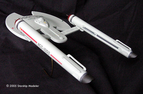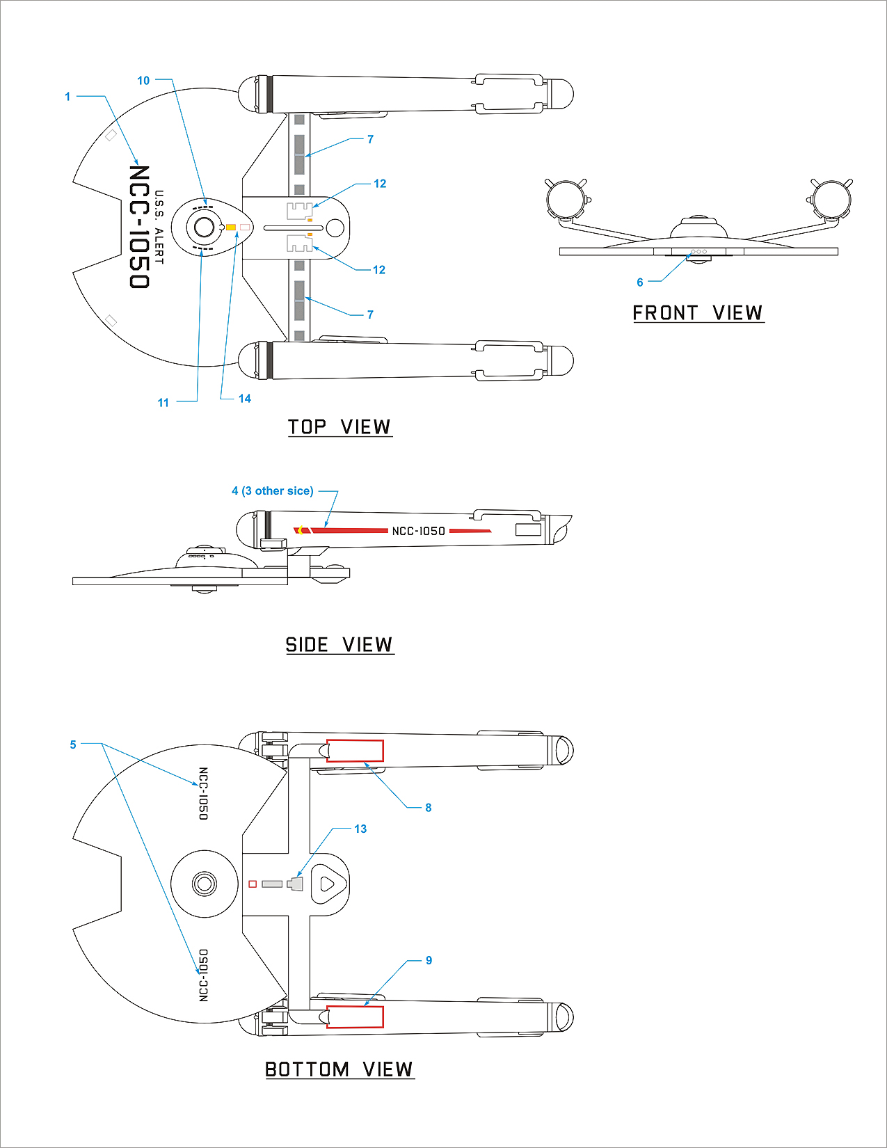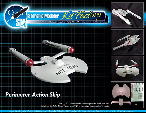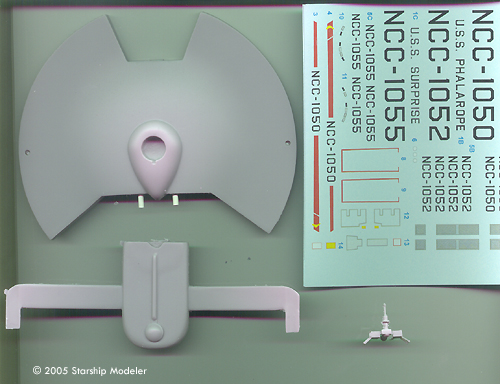 Starship Modeler is proud to announce the Alert-class Perimeter Action Ship conversion kit for the Polar Lights® Enterprise. The kit, comprised of 3 resin parts, (including optional sensor dish support) includes ALPS-printed waterslide decals with markings for three ships (Alert (NCC-1050), Phalarope (NCC-1052 )and Surprise (NCC-1055)). Also included are self-adhesive templates for optional supllemental ablative armor panels. Parts needed from the Polar Lights kit are a clear bridge dome, warp nacelles, sensor dish if desired and some decals (if desired).