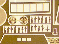 The brass is quite workable: hard/stiff enough that it is not easily deformed by careless handling, yet soft enough to be eaily cut/filed. Attachment points for the parts are commendably thin and esily trimmed with a standard hobby knife. All but a few parts can be used "as-is" - no complicated folding or bending. Exceptions are the cargo containers and shuttle bay elevators. Exterior window framing will need to be bent a bit to conform to the full surface as well. Everything is very crisp and will really 'pop' under a light coat of paint. The details included are logical additions - things that are difficult to do this fine in injected plastic (or at least difficult to do in a form that survives normal handling and shipping!). Unlike some aircraft sheets I've used, there are no details so tiny you wonder why the manufacturer bothered; there are some on this sheet small enough to be disappeared by the carpet mafia though, so you'll still want to be carefull when using them. Especially the ladders in the shuttlebay 'maintenance alcove' and the itty bitty people. |