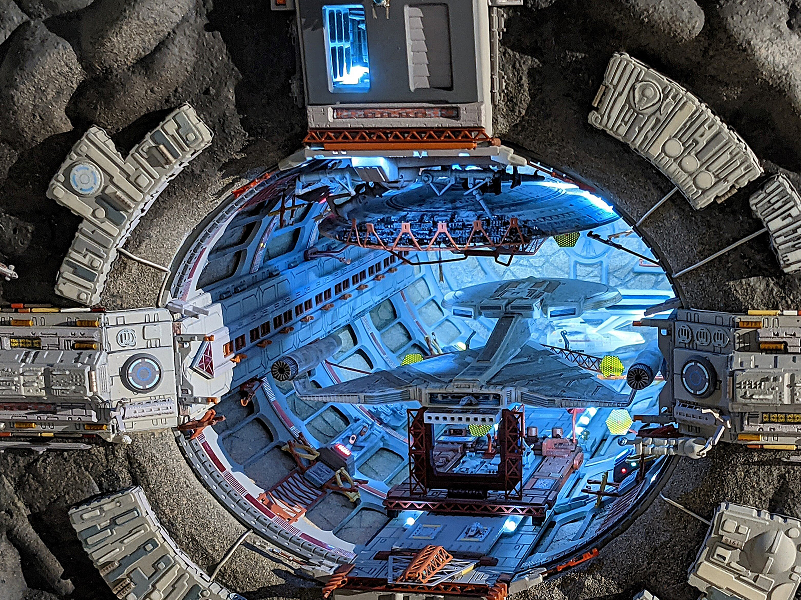 Octomber 2025. Asteroid Dock by Mike Walston. Mike says " I kitbashed Polar Lights' Discovery and AMT's Enterprise-B kits to make a 1/2500 scale "McQuarrie-prise." Engines are made from plastic tubing. Kit decals were modified on CorelDraw. The docking pallet is made from engraved plastic stock and a painted circuit board. I cut off the Enterprise-E bow and used 1/16" plastic shavings to depict collision damage. Runabouts inside the dock are from the DS9 kit. For the Asteroid Dock, I cut a hole in a 13 x 10.5 inch plaque, and used 1/32" plastic stock for the rock interior, with 1/16" stock for the interior supports and supply bays. Details were cut on a CNC router with patterns designed on CorelDraw and DesignCad. The surface was detailed with parts from an Alpha Moonbase kit. Additional scaffolding came from Metal Earth kits."