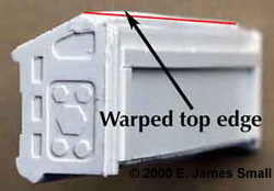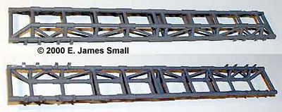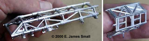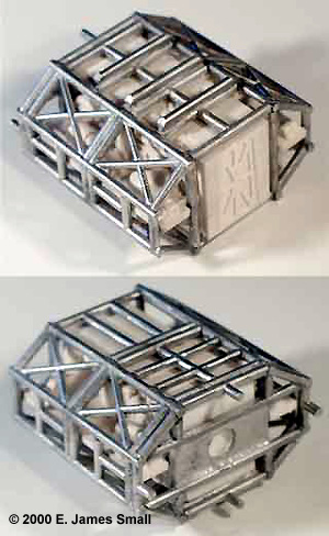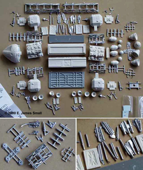 One of the biggest jobs in building this model is cleaning up the tremendous amounts of flash present, especially on the metal parts. Plenty of patience, a Dremel tool and several types of needle files made life easier. Files work well on the very hard resin too. Be prepared to spend many hours cleaning up the parts ready for assembly, as this also familiarizes you with all the bits to prepare you for the steps which follow. After cleanup, the fine tooling of the model becomes more apparent. Assembly Following the instructions, which consist of four pages of basic text and very crude sketches, I assembled the two-piece spine first. I understand that newer kits have a one-piece spine, as it says so in the instructions. So my question is, if the instructions note the improvement in the kit, why did the kit come with the two-piece spine when the improved version was already available? The body frames were next to be built. I took a bit of a detour from the instructions in that I decided to build the metal frames separately, then slide in the detailed "boxes" after the frames were put together. The instructions suggested that the frames should be assembled AROUND the boxes, but the severe warps and sags apparent on the roofs would make that method of assembly difficult to get everything square. In order to slide them into the frames, I had to sand off all the detailing on the top and bottom of these boxes. I later replaced this detailing with some tiny model kit parts.