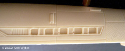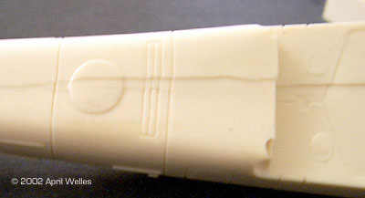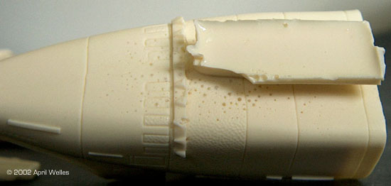 I looked at the original design drawing for this (located in the reference section of this site) and saw that there were indeed four narrow rectangles in front of the windshield, however, they were only panels, not any raised items (as seen by comparing the plan view with the elevation view). It was also missing the rear braking thrusters located in front of the main engine, though it does have the upper triangular piece the original kit is missing. There is also a large seam running from under the fuselage where the wings go, almost all of the way to the nose. Plus there is a raised circle beneath the cockpit (who knows what it's for? Perhaps another logo?) that ends up not being a complete circle, but skewed a bit. The wings seemed to be pretty good: nice details, good molding, no bubbles. However, when placed on the model the scribe lines don't match up exactly. One is actually further off then the other. So, to try and compromise and center it and have the scribes look like additional lines won't work. Many of the window frames had bubbles in them, too. Building The first thing I did was to wash all of the parts. Then I removed that ghastly block of resin from the aft piece using my motor tool and cutting close to the model, but not too close. I then used my files and removed the remaining resin. Next, I needed to fill in all of the bubble holes, including repairing a few of the 'lower braking thrusters' that had bubbles in them as well. For these I used Squadron Green putty. I filled in the bubbles on the various locations and then sanded them smooth. Next, I removed the vertical vanes from in front of the cockpit viewports and replaced the frames with trimmed pieces of plastic sheet. I also filled any indentations left after the vane removal process. I carved out the nose intake with a pin-vice and used a blade to square off the top and bottom of it. I then used my blade to score and carve two small, shallow triangles above the cockpit for the braking thrusters. |