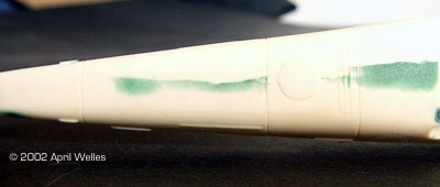 Something that I found unique about this model is that it is a recast of the original Aurora model. According to the build-up article by Michael Dentzer, he mentions that a small rounded triangular shape just in front of the semi-circle row of braking thrusters is missing on the original. Yet on this recast it is included. However, none of the other corrections that are needed (for example the semi-circular thruster locations mentioned above) are included. Odd. Though I admit, the corrections are easily done through a little carving and the adding of small parts, and most of all time. After carving I dry fit the fuselage parts together and noticed that, though a 'lip' was included, that wasn't going to be enough to hold the pieces together. So I decided to insert two brass rods next to each other with a small space between them and used 5-minute epoxy on them. After it had dried, I began dry-fitting the wings to the fuselage. That's when I noticed that the panel lines did not line up properly. And there was a bit of a warp-like gap between the aft wings and the fuselage. Not much, but I puttied it in. (Though upon reflection, perhaps I should have put a little bead of putty on the edge before gluing the pieces together, and then smoothing out the rest). After a little trial-and-error, I finally decided to also add brass rod between the wings and fuselage. I inserted two rods per wing to ensure that it stayed centered and wouldn't come apart easily. I then attached it with epoxy. Once the plane was put together, I needed to deal with the missing braking/separation thrusters in the semi-circle configuration. For these I used what Michael used for his Aurora kit; round, white, medium size plastic pin heads. I used white ones because the other colors show through a white primer and white base coast (personal experience). After all of the parts were glued together I began to putty. Using the self-same Squadron Green (mmm... smells nice) I puttied in the seams, mainly between the two wing pieces. Unfortunately, because the pieces don't line up evenly, I had to carve them in to try and connect them with as small a seam as possible. Once the puttying and sanding was completed, I began the task of painting. |