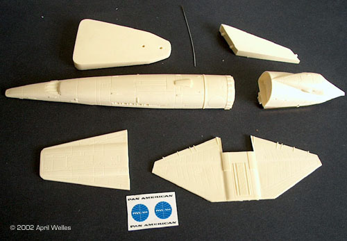 I received this model packaged pretty well in styrofoam peanuts (Yup - I know how to pack a box -- Ed.). Upon first pulling it out, I was pleased with what I saw. The kit comes in eight pieces (including a two-piece base and a wire for the rear antennae), plus decals to make the Pan Am plane. The parts seemed to be molded pretty well and appeared to have minimal bubbles. Instructions were not included -see John's In-box Preview of this particular kit - but they are not needed.