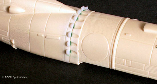 Image: Lower fuselage seam puttied and smoothed ^ Rear thruster nodes replaced ^ Pinning the wings |