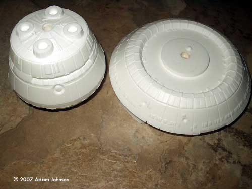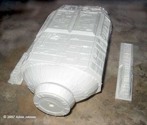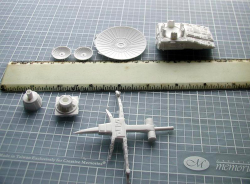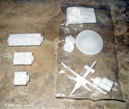 Image: What you get ^ Command sphere, dryfit Image: Command module halves Image: Command sphere with ruler for scale Image: Bottom half of the command sphere Image: Command sphere front piece Image: Collar and sphere backplate Image: Detail Image: Collar/back plate Image: It's big! ^ Antenna parts Image: Antenna and storage modules Image: Antennae base Image: Closer look at parts Image: Antennae mast ^ Reactor front Image: Reactor/engine module, with 12" ruler Image: Nice detail Image: Side panels Image: Rear of the reactor ^ Engine Image: Engine nozzles Image: Another look Image: Cargo modules Image: Closer look Image: Stand components |
