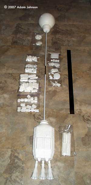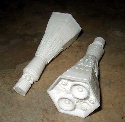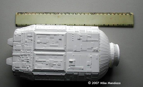 It's about time someone came out with an accurate model of one of the most famous space vehicles in film history. At a price tag of $575.00, it seems steep until you get it and realize what went into this…. THE PARTS: GENERAL OVERVIEW Time Slip Creations' Discovery XD-1 kit comes in a sturdy cardboard box, and a separate mailer tube for the brass spine support piece. Inside, the main parts were all individually wrapped in soft tissue, and the smaller parts contained in zip-lock bags. All were in Styrofoam peanuts to prevent damage. Quite overwhelming to see so many parts! The 'Head or 'Pressure sphere' is cast as an open two-piece unit 6” across. Presumably so that one could add a small cockpit and podbay to enhance the model. One of the podbay doors is open and comes with two separate podbay door pieces to display in the 'open' position if desired. Photo-etched brass pieces comprise the grille in the back of the engines, and the delicate frame in front of the antenna dishes. Also included is a laser-cut clear acrylic stand to rest the model on. The huge nuclear reactor core is a single piece of roto-cast thin-walled resin. More like an injection molded piece than a resin cast! The 'collar', a back plate to the head, three aft engines, and many bags of parts that comprise the triangular storage modules along the spine. The parts are all exquisitely pressure cast hunks of pure white resin with not a bubble or pit anywhere. And the seams; well, they are not detectible, just a small release bump and no flash. The joint where the cast parts come together is perfectly aligned, and only a couple of minutes of filing and sanding is necessary to clean them up and make them disappear. The detail is outstanding, and there's loads of it. All the panel lines, raised panels and piping is crisp and sharp. Very well executed. Also superb is the 62 storage modules that run the length of the connecting spine. All are as finely cast and detailed with not a flaw in the bunch. Overall, the only clean-up on the entire model is the mold release points. LET'S COMPARE….. First thing I did was get out my book of 70mm frame blow-ups I've been collecting for thirty years. Then I held each part, one at a time, and compared them to the photos. The first thing I noticed is that this model is dimensionally accurate and faithful to the giant filming miniature in 2001. Upon closer inspection of the model pieces, I compared all those little detail bits in the photos against the model. And, what a surprise to see that the detail was actually correct!! The folks at Time Slip obviously spent a lot of time to get this one right. THOUGHTS ON BUILDING...... It seems the logical place to start would be the all the storage modules on the connecting spine. They'll have to be very carefully aligned and probably pre-painted in certain areas before assembly. Then, when that is all done, attach the collar and reactor core, leaving the three engines, antenna and head till last. My personal opinion is to seal up the podbay with one of the spare doors. I'm more concerned with viewing the majesty of the whole model than what is in one small opening. However, a simple command center in the window with some lights will finalize the look of the head. There is plenty of room to run lights through the brass rod. The window opening is very small, and I don't see any reason to put more than a couple of seats and a suited guy in there. The three hexagonal shaped engines at the rear will need some additional support, as they are quite heavy relative to the contact area at the back of the reactor core. Probably insert a piece of brass rod in each one. My only concern is that the brass tube that is supplied with the kit is not strong enough to support the weight at each end. At this time, it seems it will have to have a support under each end - just like the filming miniature in 2001. Painting the model will be unusual. I'm certain that it was an off-white color. The head and collar have subtle shades of grey added here and there. But everything behind the collar was a straight off-white. In order to show all that wonderful detail, one will have to due some artificial shadowing all over it- but be careful not to overdo it. The intention is to highlight the surface detail only, without any weathering. In the next part of this review, construction of the spine and storage modules will be detailed, then the head, and finally the reactor core. SUMMARY After seeing this model, and visualizing the whole thing done, I don't think there should be another one made. The buck finally stops here! The instruction sheets are currently online at the 'discoverybuilders' forum hosted by Time Slip Creations. This group forum is dedicated to people who have purchased this model and share their modeling ideas. Most interestingly, the site is loaded with rare and unusual pictures of the original filming miniature from 2001:a space odyssey, which will be very handy for building this kit. |