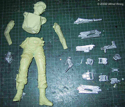 What You Get Four resin parts make up the figure, consisting of a torso w. head, the legs, and the two arms. The hands are in white metal, cast integrally with the gun grips. Fourteen metal parts make up the smartgun, which in the movie was an ingenious coupling of a Spandau MG-42 with a steadicam mount. It was a fully functional prop. The instructions are very poor; the figure may be a no-brainer, but the gun is fairly complex. How it goes together is not at all obvious, and the instructions are of little help in this. |