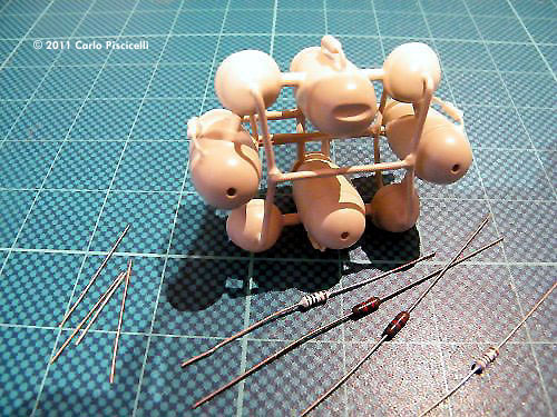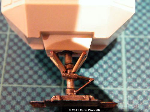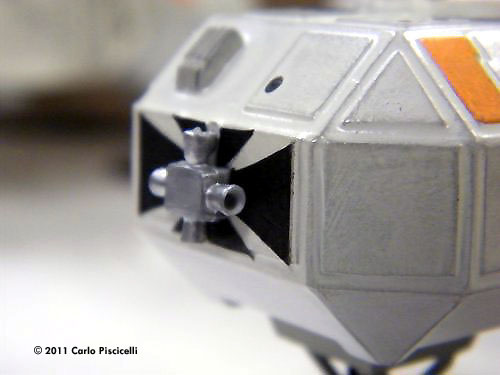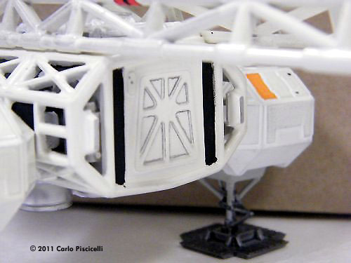 I did however decide to build a different Eagle to the one I had. I chose to build an Eagle Passenger Transporter and to do this on a budget. I scrounged and scratch built all the additional parts I needed to complete this model as I do not believe that to build a good model you must always have to buy expensive accessories.I used every day items, which I am sure you can easily obtain or have lying around your home or workshop. I had fun doing this and at the end of the day I think it worked out well. So here's how I went about accurising and finishing my Eagle Passenger Transporter. Getting Started To begin with you need to drill out the space between the girders of the engineering and service module. This is tedious and care is needed to ensure that you do not damage any of the support girders. Drill out the windows, side end doors and side panels on the passenger pod and clean them up. Then using a Dremel tool remove as much of the inner plastic as you can within each window and finish off using a scalpel blade and several small files to clean up the corners and edges. Do not be tempted to rush this as the windows stand out on the finished model and as such any imperfections will ruin the overall appearance of the completed model. Alternatively, a picture or photo of the interior of the craft placed inside of the pod to simulate the interior with lighting could be inserted if you really wanted to and were keen enough to do so. However, my simple technique proved to provide a subtle nice effect. After measuring the internal length and height of each pod I cut out four square pieces to be used as the internal bulkheads. I used a sheet of 1mm thick plastic card to do this. On the outside face of the plastic card walls between the girders I added some odds and ends from my spares box to build the ducting system. They look complex and functional, just the right mix for this model. The systems were then all sprayed with a gloss Tamiya Neutral Grey and left aside for a few days to dry. Plumbing The next step was to enhance and detail the engine array, which was going to be a challenge; many images were down loaded from the net, which I had to compare and study in order to undertake this part of the project. Reference material is always essential when undertaking such a modeling project such as this. Using 2mm thick copper wire and some very old resistors from an unused antique radio, I constructed the pipework and extra fuel pods for the main fuel tanks. Drilling the little balls I added the pipe work followed by the resistors, which were superglued to the main tanks. If you don't have any old resistors handy, you could cut and shape the part using a piece of thick plastic rods from old kit sprue. Then using a thin drill bit, I drilled to allow a thin copper wire to be inserted through this. Everything was then sprayed using Tamiya Light Grey overall and left to dry. As you can see from the image the result was a great improvement on what was before. Landing Gear While the main fuel tanks were drying I then focused once more on the landing pods and landing gear. I must stress that the landing gear provided in the kit is an absolute shocker. To begin with the landing pods and gear look wrong and under scale compared to the size of the model they are supposed to support. As a result, they do need to be enhanced big time and again, my spares box came to my aid in the form of a set of 1/144 scale Boeing 747 Jumbo landing gear. Cutting 2 mm from the top of the landing strut I then removed the wheel connections. This worked a treat as it ended being the right height for the Eagle. After cleaning these parts and sanding then down, I then sprayed them with Tamiya light Gun-Metal colour. The result was perfect! The landing pads were next, so I removed the center-landing pin and sanded this as close as possible to the base. Care and attention to detail was required to ensure I did not ruin the landing pad. This process was repeated for the other three landing pads. I sprayed them all with the same colour as the landing gear and let them dry for a couple of hours. After which I proceeded to glue the landing gear to the pads. What a pain this was to get them straight! I ended up having to actually melt the two ends together with DCM liquid glue (i.e. Dichloromethane Glue). It looks pretty realistic to me and once the silver parts were painted in, that's some handsome landing gear. The next step was to drill out the landing pods in order to fit the landing gear in place. The center of the pod was drilled out with a 6mm drill bit. The sides were then filed down in the middle of the hole to about 2mm depth using a 2mm file. A sheet of plastic card was then cut to size and shape to enable it to fit in the middle of the pod. This was then glued into place. Once the landing gear was glued into place, I felt that the whole assembly needed a little something extra. So I decided to add struts between the landing gear strut and bottom of the pod. I cut 5mm lengths of 2mm copper wire, which were then super glued into place. Not bad even if I do say so myself. Front Office You do not need to do much to the Eagle's nose cone apart from painting in the window frames and spraying a very light coating of Tamiya light grey. This is a form of shading to simulate the paneling in certain areas. Black "dots" strategically placed on different panels help to simulate the locking devices that were on the actual TV show models and provides a subtle overall effect to the nose. Engine Assembly The engine bells were next. To these I made up some four flutes which go inside of each bell. These were cut slightly smaller in circumference to the engine bells using an 18mm borer. A 4mm center hole was then drilled out and an additional four 6mm half holes were cut on the outside edge of the flute. Once this was done the disc was then super glued just inside the engine bell. You have to repeat this process 3 more times to the other engi