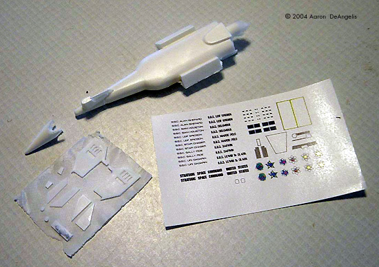 Instructions The instructions included are just a schematic of the finished model. Smaller details, like the hatch and radome's location, are pointed out to you. Decal positions are not shown, which was a little annoying when applying them. Clean up On the hull piece the mold was slightly misaligned, making a half-millimeter break along the hull. The misaligned area is small, and can be quickly sanded down (or puttied up, I suppose.) There is a pour stub on the back that can be easily removed with a hand saw. The resin is nice and soft, so the saw had no trouble cutting it down. As I am building the "Mark I" version of this model, I removed the sail on the aft of the conning tower. The wing segments and detail parts are all on one "sprue." They need to be cut off and have the flash removed before being glued to the hull, or used as patterns for cutting styrene replacement wings. In my sample, the bubbling on the bottom of the cast wasn't too bad, and could easily be hidden with a bit of primer, so I decided to use them. Assembly The wings need a little trimming to fit onto the model. A few millimeters removed from the front of each main wing allows them to fit snugly to the hull. The "dive planes," radome and hatch are tiny little bits that you need to be extra careful with when placing in the hull.Paint I painted the model in Model Master light gray, with engine exhaust and intakes in black and insignia red respectivly. I painted the sensor radome copper. Yep, that's about it. Decals The decals were my favorite part of the model. They are very well done, and come off the sheet like opposed magnets. Names included are Alan Shepard, Sam Houston, Leif Ericson, Star Chaser, Sally Ride and (in '60's bubble letters) Leif Ericson, Columbus, Marco Polo, Darwin and Lewis & Clark. As the instructions were lacking, I took some creative liberties when applying them. The windows location I wasn't sure of, and I couldn't find references anywhere on the net. I did a little guess work looking at other peoples Leif's, and I think it came out about right. I named my vessel the SSC Uri Gagarin, after the first man in space. Last Word This model was completed in a weeks' time, and I must say that it was loads of fun to put together. Someone new to resin modeling might be frustrated with the kit, with the extra work involved, but I loved it. I recommend this kit to anyone looking for a weekend project, or anyone who can't afford the original kit on eBay (Ha!) Many thanks to Jay Curtiss for the review sample. |