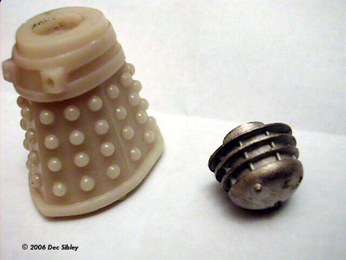 It is said that a fool and his money are easily parted, well thanks to Ebay its even easier, and I found myself bidding for these 1/35 Daleks with out a second thought. Made by Media Collectables I bought 3 in the end and paid about £20.00 for the lot (approximately $34.87), which I didn't feel, was to bad as they are no longer in production. (See note at bottom) One of these later went for £30.00(approximately $52.30) for a single Dalek so perhaps I got a bargain after all. This “in box” review will be brief as there is little inside the packaging. The scale means the model stands at 50mm tall when assembled. This is however one of the best things about these Daleks. Being 1/35 scale means that a whole host of military kits of vehicles or Diorama accessories can be used, something I'm already working on. What You Get The carton is a clear plastic bubble pack with the components visible, flanked by Dalek artwork. Inside is a sheet of instructions and the bagged up pieces consisting of a resin body a white metal head and grill plug and finally a small white metal sprue of 3 parts for the sucker, gun and eye stalk. |