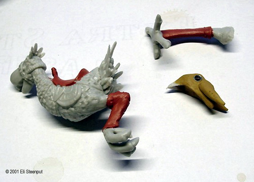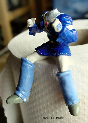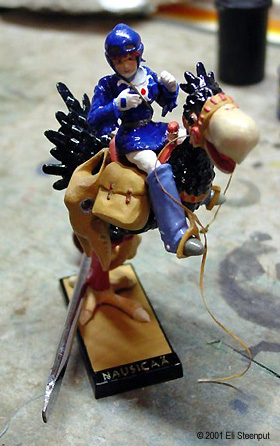 The Kit The model seems to be mostly based on this watercolor painting, with a number of modifications. The painting shows Nausicaä in a situation that does not actually occur in the story. The sculptor seems to have taken the pose and modified it to fit Nausicaä as she would appear between her joining the Tolmekian army and the battle of Sapata. In the model, unlike on the watercolor, she is wearing her modified Dork dress. I think the sculptor did a very good job converting a drawing into a model with a quite exciting pose. Note that in the drawing, Nausicaä's head seems twisted a bit too far for comfort, and Kai is missing a toe on his left paw! The only downside to the pose seems to be that that gun is in front of her face for most interesting viewing angles. The box claims the model is 1/20, but how they arrived at that is a big mystery. The finished model is about 11 cm from the 'ground' to the top of Nausicaä's head, so 1/1 would be (brief fantasy of a 1/1 scale version in the front yard) 220 cm with Nausicaä herself about 1m30, which seems a little on the small side. The model seems fairly accurate, about as accurate as you can get to a manga character - unfortunately, Miyazaki is not always consistent in his drawings, and usually not in his use of colors. Construction The kit has 36 plastic parts on 2 sprue trees. The instructions are completely in Japanese but construction is relatively straightforward. The box art choice seems unfortunate, as it shows a very atypical color scheme for Nausicaä. There are two *very* small tiny photographs of a finished model on the side of the cover. I suppose the (Japanese) instruction refers to the box art for color selection, but I had my own ideas on the colors anyway. The parts on my kit had fairly large amounts of flash, but most of it is relatively easy to remove. Most seams or sprue connections are in easy to smooth locations, and as the kit represents living matter it is fairly forgiving. The sword as shown in the instructions has an inaccurate (too short) handle. You will have to sculpt part of the sprue to get the correct handle length. There are supposed to be buttons where the sprue connects to Nausicaä's ankles, so don't be too enthusiastic in smoothing this area. I started with the gas mask and Kai's body. I cut out the eyeholes on the gas mask and glued bits of transparent plastic in place (not easy since the holes are not flat circles). I painted Kai completely before attaching the standing leg, to more easily paint the legs' details. The fit of most parts for Kai is more or less OK except for the feathers on the head and tail, and the toes on the standing leg, which required several layers of liquid cement and filing to hide the seams. Any misalignment is easily camouflaged among his feathers. I wound some dental tape around the saddle horn as all references show something wound around that part. I regret not hollowing out Kai's beak before gluing his head together, as I think it would look a lot more realistic. The saddle blanket is almost completely covered in the finished model so I might have saved myself the trouble of painting it. There are various holes on Kai's body to attach saddle bags and other hardware. Fill them up and forget they were ever there. They will NOT help you. I then started on Nausicaä. The 'visor' part is so ill-fitting that to install it would require lots of sculpting on the head. At this stage I didn't feel like doing so. It should probably be integrated with the head before any painting is started. My biggest mistake was probably to view Nausicaä and Kai as two separate models to build and then combine. Fortunately, I test-fitted Nausicaä on Kai before the glue for her legs was completely dry. It may be smarter to glue her in the saddle before attaching her lower legs. I thought the upper edges of the leggings were way too sharp, so I rounded them with a file. The stirrups will not fit no matter what, so just accept you will have to lengthen them and try to find the best fit for Nausicaä in the saddle without worrying about the stirrups. Also don't pay attention to the indicated location of the saddle bags. Add them in a location that seems natural to you after fitting Nausicaä in the saddle. I was able to twist the left leg to make the left stirrup more or less match, but this made the saddle bag position impossible. The right stirrup had to be extended, for which I cut a bit of toothpick to shape. Note that the bags will cover most detail on Kai's saddle blanket and the back of Nausicaä's leggings. I moved both bags higher than indicated, and the one on the left had to move to the rear. I attached all the bags only after fitting Nausicaä in the saddle, which I think saved me much grief. You could of course decide not to add any bags, gas mask, Teto... Nausicaä on the base will have a tendency to fall over backwards. I glued a 2$CDN piece to the underside of the base, in front, and it seems sufficient. I may add a wood base later when I happen across a suitable bit of wood. Colors I usually mix my own colors, so I cannot give accurate color descriptions. I used Revell paint in gloss black (7), white (4), silver (6), night blue (51), Ferrari red (31) and yellow (12), and matte white (5), ochre (88) and skin color (35). I also used some leftover gold-colored household paint. For Kai's harness, which likely belongs to Yupa, I selected a color scheme of red and earth colors. Kai is shown in most color pictures with either black or blue feathers. I choose to ascribe the blue to the average water color painter's aversion for black. I painted Kai's feathers in gloss black with night blue highlights, and the rest of him in various mixtures of ochre, gloss white, Ferrari red and yellow. Nausicaä herself dresses mostly in white and blue. The Indian-style Dork dress was originally red and knee-length, but after Nausicaä's attempt to rescue a wounded Ohmu, it was colored a very distinctive bl
