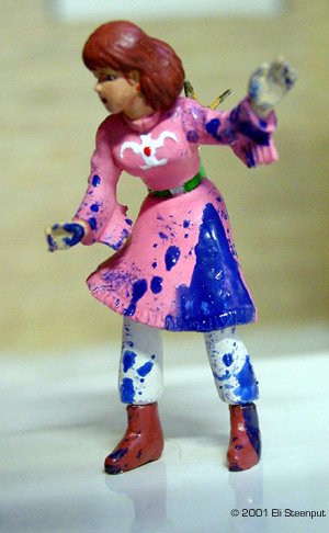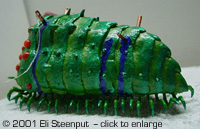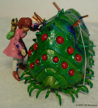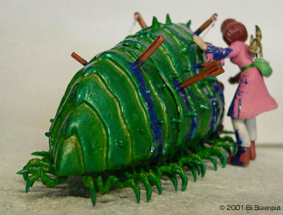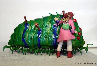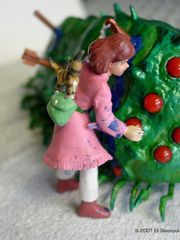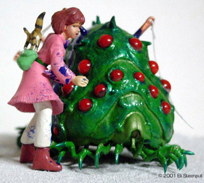 The Kit The kit has about 6 parts for Nausicaä and for the ohmu 7 body parts, 14 transparent eyes, and some 52 little legs... There are also parts for the squirrel Teto, the big machine gun that figures somewhere in the episode, and 2 harpoon-like things. The kit represents the end of the movie, or the start of the story in the graphic novel, where Nausicaä attempts to save a baby ohmu (giant insect, yes they grow even bigger than this) that was wounded by some people so as to enrage a herd of the insects into trampling some other people. Nausicaä appears dressed as in the manga (in the movie they left out the fringes on her dress, probably too expensive to animate), with an (optional) belt pouch (not present in the movie) and big knife (in both books and movie she lost hers by this point). Her face seems a bit too chubby, but other details are nicely done. Construction The construction of this kit is almost trivial after cleanup. The major body parts come together easily, with only some gaps to fill. I did hollow out the segment edges a little. The legs can be put 'in any order you like' so this too is simple. The eye positioning is clearly marked in the instructions. You could decide to leave the ohmu like that and pretend it's a 1/144 adult, but since I wanted to recreate the famous rescue scene, I had to add the wounds. On this point the kit is a little disappointing; there are only 2 'harpoons' included while my references show at least seven, along with other minor bleeding impacts. So I marked he impact spots based on the manga, dropped a few that seemed excessive, drilled holes in the body and stuck bits of sprue, toothpicks, and even one of the provided harpoons in them. The ones with 'eyes' I formed from sprue, and added bits of dental tape to represent the attached lines. Nausicaä herself was also straightforward. I discarded the knife but added the belt pouch, on which I filled the hollow back as I suspected it might show otherwise. The 2 parts for Teto required some filler, but that pretty much sums up construction. Colors The instructions say: 'for painting, use package illustration and color photos as reference.' Well, the color photos contradict the illustration almost completely. So I followed my own idea of what the colors should be. I wanted the ohmu to look as much as possible like a magnificent glittering insect. I choose green as its main color, based on plenty of references (the only occasion we see a gray-like ohmu as in the completed model shown on the box, is in an otherwise off-color flashback sequence in the movie involving a much smaller insect), and also for best contrast with the red eyes. I painted the body satin leaf green, mixed with metallic green towards the outer edge of each segment, and with gold towards the inner edge (the gold was inspired by the ohmu's 'golden feelers'. The legs were leaf green with metallic green ends and gold at the joints. These were mostly painted on the sprue. Almost all paints used were from Revell, and applied by brush. The position for the eyes I painted gold, and the inside of the eyes was covered with red drawing ink from Rotring. This makes them seem to glow. They were glued on with thinned white glue. An unforeseen and unfortunate reaction seems to have developed over time between the ink and the glue, as if the ink is "drawing away" a little from the glue. It's only noticeable on three of the eyes and if you look real carefully though. For the blood, I first let a thinned water-based silver paint trickle down from each 'wound' to establish a natural-looking flow as well as provide a base for the glossy night blue. For Nausicaä I choose an apparently somewhat unusual paint scheme. In the story, when she arrives to rescue the ohmu, she is wearing a pinkish dress, which during the event is dyed blue by the ohmu's blood, and this fact becomes a major plot element later on. However, this color switch is not handled very satisfactorily in any color illustration I have seen so far; one moment her dress is completely pink, the next it's completely blue (yet without turning Nausicaä herself into a smurf in the process). I opted to show Nausicaä halfway through the process, which I think emphasizes the cruel bloodiness of the situation. For the rest I followed the book over the movie, so Nausicaä herself is not wounded, and she carries her belt pouch. |