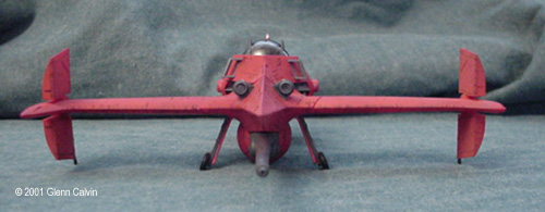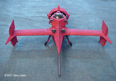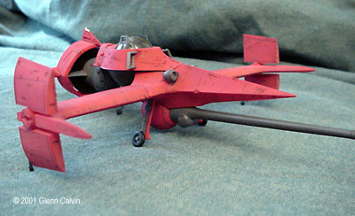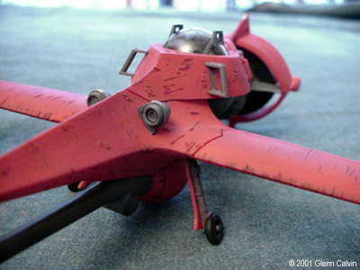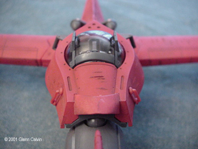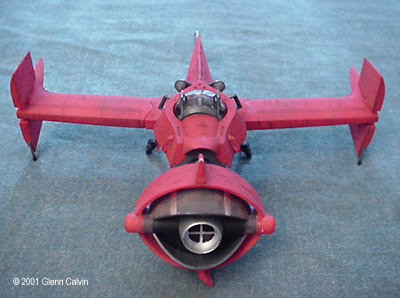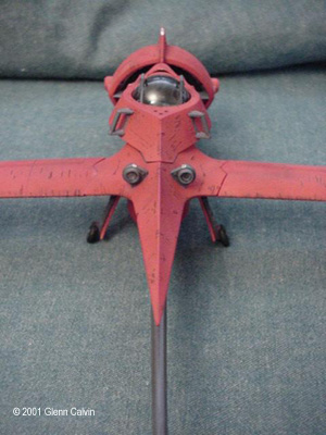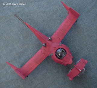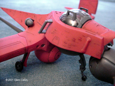 In addition, I used several of the above colors to make a very thin color wash that turned out being a very reddish brown that was just a bit darker than the base color of flat red. I applied the wash AFTER using the Gundam marker on the panel lines (simply smearing off the excess for that "dirty" look) and AFTER battle damaging the hull. This allowed the wash to settle into the scars. I simply wiped the excess wash of with my fingers (again for that "dirty" look). After the wash had dried, the flat red color coat was sprayed onto the various hull surfaces. This toned down the "dirtyness" to make it look a little more realistic, I think. I tinted a clear plastic canopy for the first time with this kit. I used Tamiya Smoke X-19 through the airbrush on the INSIDE surfaces of the canopy. It turned out pretty darned good for my first time. Next time, thinning the smoke 1 to 1 with denatured alcohol might make it come out a bit clearer. It really didn't turn out as dark as I thought it would, but it's a nice touch that adds a little bit of realism to any project. The main problem that I ran into during this project was that the diagram that shows the wing hinges (for the ship's folding wings) DOES NOT SHOW that they are slightly different lengths. It probably tells you that in JAPANESE. Oh well. I installed the long one into the wrong wing and vice-versa, so when I went to attach the wings to the fuselage, the fit was off by about 1/4". I ended up having to cut the hinges and permanently glue the wings in the extended position. I only made one other (dumb) mistake with the kit in that I forgot to install the landing gear prior to gluing the two fuselage halves together (D'oh!). A little trimming to the landing gear struts and some glue fixed that problem. This is a fun kit that should be okay for the beginning to intermediate sci-fi kit builder. However, it has excellent potential to become a fantastic looking completed kit in the hands of the expert builder as well (with a little bit of extra attention). A kit preview by John Lester is also available here. Additional Images: |
