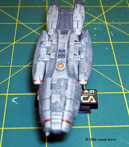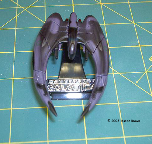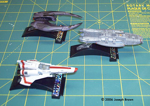 ^ The first three releases ^ The mighty Galactica Image: Modifying the landing bays, Step 1: take apart Image: Step 2: separate Image: Step 3: trim these areas Image: Step 4: test fit Image: Done Image: Galactica, from the front Image: With the Bergstrom gamining mini Image: With the Konami (TOS) Galactica Image: With Alliance's kit and Konami ^ New Raider Image: Starboard side Image: With the Konami Raider Image: Another look ^ New Viper Image: With the Konami Viper |