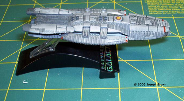 The new Battlestar Galactica TV series is a refreshing reinvention of the 1970s story, and some of the most exquisitely done television that I have seen in a long time. And, it's nice to see some product support from Hasbro! Something worth noting: the Mark II Viper that you get is in the package for the Mark VII, making me wonder who messed up where. The short 'history' text on the back seems to be indicating the newer Viper as well The Viper does have retractable landing gear that works, but it looks so much cooler on the stand that I'm probably not going to be using the gear much. What You Get Secure in their individual armored packages, you get the Galactica, the new Raider, and the Viper (Since Joe wrote this, the Viper Mk VII, Raptor and Colonial One have been added to the line- Ed.). Each of them has a simple but functional stand. The mounting hole for the Galactica is way in the rear, near the beginning of the engine pods. Why there? When you see the disassembled view, you will observe that the more logical center area is taken up by the way the hanger pods retainers are installed. Could they have done a better job? Perhaps, but there is not much room to play with there. Hard-core gamers (or modelers) can easily solve this issue with a simple modification. As you can see, t6he scale of these is "mixed". If the 'real' Galactica is 1438.5m, and the mini is 94mm, the resulting scale is: 1/15,303. Similiarly. the Viper Mk II is 8.4m, the mini is 75mm, and resulting scale is 1/112. The Raider is 8.94m, the mini is 81mm, and the resulting scale is 1/110. I've included some comparison images of the ships with the applicable Konami 'candy-toy' ships that came out in 2005. While I did not whip out my micrometer, plainly the sizes are very close to matching. In other words, they all look good on the shelf (or gaming table) together. And, because someone is sure to ask, I also included shots of Studio Bergstrom's gaming miniature of the new Galactica and the Alliance's resin Galactica. Assembly and Finish Assembly doesn't really apply here. You take the toys from their packaging and set them on their stands. Done. Many people have commented that the hanger pods on the Galactica don't want to extend fully, and that is true. But, an easy fix is to flip the ship over, unscrew the two Phillips screws, and then carefully shave away at the parts that function as stops. I carved away almost 2 mm of the applicable areas on mine, and that seems to have essentially solved this issue. (See the circled areas of the ship's innards.) Just reassemble the ship, and test to see if you are happy. Overall, the paint scheme is acceptable. If you don't care for it, modification would be easy. Enamel or acrylic paints can be used to create any color variations that you desire. I'll probably try toning down the purples on the Raider first! Conclusions Perfect? No. Great value for the price? You betcha! Run out and buy some, or order some online. And maybe, just maybe, we'll see more of these cool toys. Like a Basestar, Heavy Raider, a Galactica Crew Shuttle, and then there is the Blackbird and the whole Ragtag Fleet . . .Recommended! |