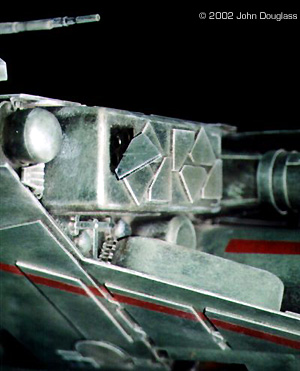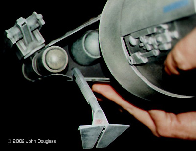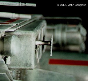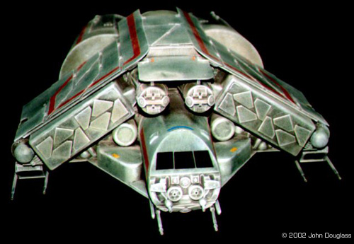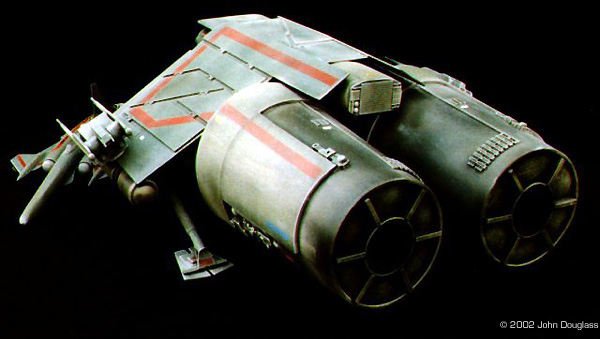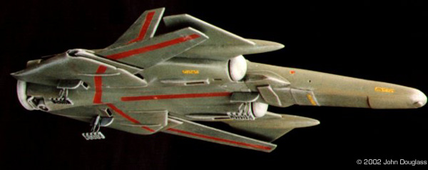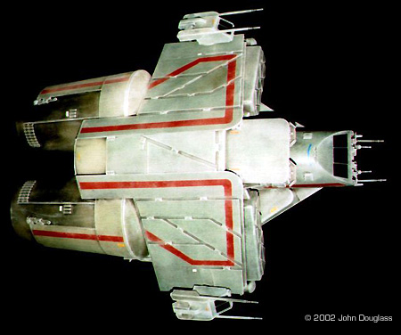 | By John Douglass - images & text © 2002 I was commissioned to build two spacecraft miniatures for a film project. No sketches or plans were presented. Instead I was given a few design constraints. Both ships had to have landing gear as they were both to spend some time in a hangar, but having movable landing gear would far exceed the budget, so the gear need only be two-position. The guns were to be similarly positionable instead of remote-controlled. |