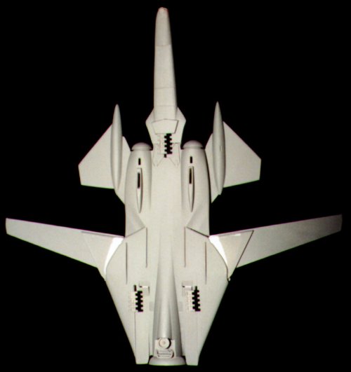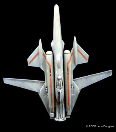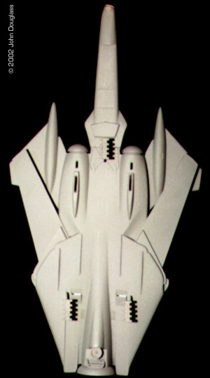 Image: Overhead view, weapon extended Image: Wings extended (top view) Image: Unpainted model, overhead view (wings closed) |