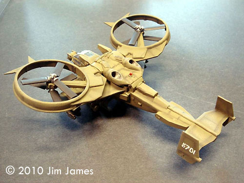 Minor Modifications I made a few changes to strengthen and improve the model: Weaponry The weaponry on the Scorpion is what makes the craft distinctive. Some pieces like the Gatling guns under the forward winglets and the nose turret are really nice. The Hellfire missiles and racks fall into the OK category and I replaced both the missiles and rack with AH-64 parts. The FFAR pods are OK but the pylon arrangement is confusing. The instructions call for the pods with long pylons to be glued to the wings. There are already short pylons molded into the wings and there's no indication if they are a guide or a base to glue the AGM pylon to. Either way, the FFAR pods would end up hanging too low. Lining up the pods is a nightmare. The first row of three is staggered and the second row of two is staggered so the front of those pods falls between the staggering of the bottom three. Lining the pods up with the stagger and making sure they a consistently spaced and parallel to each other is difficult. I ended up rebuilding the pods in styrene just to make gluing them together easier. I also made black decals to detail the front of each FFAR pod. This allowed me to paint the missile tip area with Zinc Chromate and mask off each missile and the inside of the tube front with the decal. The mounts for the Gatling guns on the front winglets need to be trimmed drastically to prevent the guns scraping on the ground (they default to the pointing down position). Decals The kit comes with white tail numbers and alternate tail numbers just in case you want to build a fleet. I added two yellow stripes around each Hellfire, a black “No Step” on each of the smaller front winglets, the fronts to FFAR pods and some thin white lines to the nose gun. The Cockpit The one really weak part of this kit is the cockpit canopy. You get two clear vacuuform canopies but no resin plug. Cutting them out can be a hit or miss operation and, frankly, I can never seem to get the edges right. The frame detail is very soft and when compared to screen caps, the frames are about twice as wide as they should be. There is very little that can be done about it and because the frame edges are so soft, it makes masking difficult. Given that fitting a vacuuform canopy is a less that joyful task, I detailed the cockpit and glued the canopy in place. After filling the seam between fuselage and canopy with white glue and Mr. Surfacer, I masked the whole canopy, painted the model and detailed the frame work with painted decal. Paint What can I say; it's Olive Drab all over. You can paint the Hellfires black and the rotors black with silver (steel) hubs. I used a fine sponge tipped brush (eye shadow applicator) and “painted” the panel lines a very dark green pastel mix. Using the sponge tip creates a dark center line with a bleed on either side. With all the under wing stores, it's best to paint the wing roots and first row of FFAR pods before adding the second row. Display I plan to use a simple base with floor modeled on a screen cap from the movie. In spite of the additional weight, the Gunship does not sit evenly on its skids (it looks tail heavy). I may add some ground clutter - tools kits, fueling pipes, electrical cables, etc. - and use one of those tubes (plugged in below the tail boom) to support the tail. Overall It really is pretty nice model despite its challenges and because of its unique design and scale; it's a nice addition to my collection. |