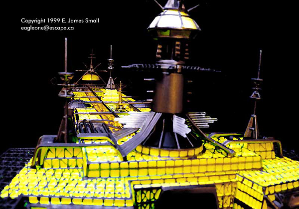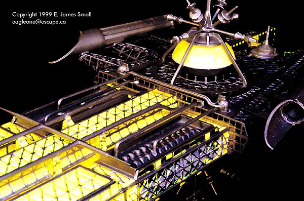 | Now came the gruelling part. This is the reason we model makers know when we are passionate about our craft. This is what tests our mettle, and questions our sanity. The most intense, boring, frustrating part of all was painting all those thousands of individual girders that completely cover the entire model. What's worse, only about half of them are molded in! I had to paint not only the molded details, but also all the girders on the sides and angled parts of the structures where no molded detailing exists. You can only do so much of this between long rests! However, after a few days work (and many glasses of adult beverages consumed), the girder work had it's required coat of tediously applied paint. Now the final assemblies could be done.. FINAL ASSEMBLY Take my advice. If you build this model, take the flimsy and totally useless "display stand" that comes with the kit and give it to someone you hate. I built a new stand from scratch that was much more robust from wooden dowels and rugged plastic boxes and a heavy base at least as wide as the ship. After you've got the model mounted to a reliable support, you can glue on the rest of the bits as per the instructions. I added a couple of extra tubes to the ends of the mid-fuselage section for a bit of added life. I photographed the model you see here under black light, which is a dandy way to display it in a darkened room too! I also had a bit of "regular" incandescent light present to highlight the non-lit areas of the model. If you want to use black light, don't buy those standard black-light "bulbs" that are sold in novelty shops. Those damned things get so hot that they'll melt your model from ten feet away. They are incandescent too so the amount of ultraviolet energy they produce is almost zero. Spend the money and get a fluorescent tube-type black light like you've seen in your neighborhood bar or dance hall. You've spent all that time and money on your model, why not a few extra bucks to display it properly! One word of caution: I know it looks cool in the daytime, but don't leave your model in direct, or, bright indirect sunlight for long. Fluorescent paint has a nasty habit of fading like crazy if left in sunlight for too long. One day of "fun in the sun" could ruin all your work. CONCLUSION Building this model was intense, nerve wracking, sanity testing and gruelling, but above all it was satisfying! It was also a lot of fun, as it's certainly one of the most challenging models to try to reproduce from a kit that I've worked on in a while. Editor's Note: According to an eMail from Brian Johnson,"According to an ex-Disney employee, the model was stored in a crate in the 'Boneyard', where old props and such are stored on the Disney lot. It was rained on a great deal, and, one day, smashed to pieces by a poorly-driven forklift which accidentally backed into the crate. Pieces of the model were taken by various folks as souveniers." |