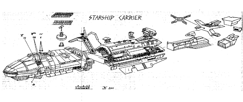 She thought so much of it that I got a tie the next year. But despite the shortcomings of the film (I didn't mind the blood) I liked it. Naturally, I really liked the Roger Young capital ship. When I found myself "Compassionately Conserved" (i.e. unemployed) I thought I'd make a killer garage kit of the Roger Young, sell it for about $175 on the Internet and retire young. Unfortunately, someone beat me to it. I watched with anticipation as month after month Monsters In Motion ran ads in many of my favorite modeling magazines featuring their exclusive retooled Roger Young, a.k.a "Starship Carrier." However, whenever I called to order, they told me it hadn't arrived yet; problems with retooling, supplier hadn't shipped them, there was uproar in East Timor, whatever - they never had the kit. Then, one Tuesday morning after breakfast (I'm unemployed remember) I found that they were taking pre-orders on their web site. I offered up the $175 thinking I'd be employed by the time it shipped. I wasn't - I got the kit the next week. This was a mixed blessing: on the one hand, I'd have time to build the model, on the other, I'd be eating Kibble and Bits while I did. The model arrived in a sturdy cardboard box. The only labeling was the cover art, masterfully color copied and pasted on by professionals. It proclaimed a 1/700 scale, 19" long highly detailed resin kit of the famed "Starship Carrier" from "Hoto Models." I'm a bit perplexed why a Chinese garage kit manufacturer would be afraid to call it "Roger Young." The name isn't copyrighted. The cover art shows a fleet of five Starship Carriers crossing space with a convenient contrasting nebula in the background. Upon closer examination (a second look) I saw that all the ships in the picture were the same ship, just a bit of Photoshop trickery (first our government, now garage kit manufacturers - when will the madness end?) Nevertheless, the picture was attractive and showed a good looking kit. Excitedly I cracked open the box, fished through a sea of Asian peanuts and found 37 resin pieces: 2 really large hull pieces, 16 miscellaneous resin, a sheet of small detail pieces with 12 parts and a small separate box containing the gantry and a five resin sprues of guns, all cast in beige resin. I guess Hoto Models was really proud of the cover art because that was the only indication offered for the construction of the kit. No instructions whatsoever. Not good. With 37 pieces and only a shadowy 3/4 view of the ship on the cover, me and the Tarot Cards board conferred on the best assembly plan. I broke down and called Monsters In Motion and under the guise of being a respectable modeler trying to do a preview of their kit for a cool sci-fi modeling web site, I got to talk to an underling who said construction should be self explanatory. I said that although I considered myself a god among invertebrates, I really needed some help here. He passed me on to a manager named Julie, who told me that the kit did not come with instructions, but she realized that it needed some. She mentioned the gun emplacements confused her. I mentioned the resin pieces confused me. She told me that they were currently creating a sheet of instructions for the kit and they'd send me a copy as soon as it was done. She said it would take about a week. Now I had time to find a job before working on the kit. No luck. Two and a half weeks later, I got a letter from Monsters In Motion with a single page diagram showing the general assembly of the kit. For the sake of future generations, I include it here. Finally having a guide, I did a detailed parts check and found that 2 of my pieces were broken or missing and another two were so badly cast that something needed to be done. Since I already had photos of the kit, I emailed Monsters In Motion pictures of the troubled parts and waited. They didn't respond. A week later, I sent it again asking for some kind of response. Four days after that, I received a curt message saying that they were trying to get replacement parts for me. More time to job hunt. Three weeks later, I received a box containing the replacement parts. So, although I got the original kit quickly, the whole kit took nearly two months to get on my workbench. Okay, let's look in the box. The kit is nice. You get a couple of pounds of resin in uniquely shaped chunks. There's not a hollow piece to speak of, so if you're going to try to light this ship, I recommend a halogen spot from across the room. I checked the model accuracy against a DVD copy of Starship Troopers (I was also looking for assembly tips) and found that the kit is very accurate. The guns are where they belong, the bridge is accurate, the exhausts meet muster - the overall shape is right on. I suspect the makers might have had access to the molds used for the film. |