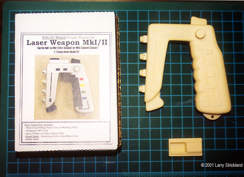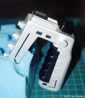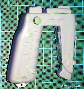 This kit only comes with two parts- main body and stun/kill selector switch. Along with these parts you get a one page instruction sheet. I thought the instructions were very good and included several helpful hints on: appropriate putty choices (Bondo Spot and Glazing Putty), and suggestions for color choices. As far as the parts themselves were concerned, the casting was very well done. The molding on my sample was sharp with very good detail. The only areas of concern were: the seam line which covered about the bottom 1/3 of the model, with a fairly large number of pin holes from air bubbles in the resin concentrated on the bottom of the weapon. This was not a major problem since 80% of these pin holes were located in one spot at the bottom of the handle. The next stage was cleanup. I trimmed off excess resin and sanded the mold lines smooth. I used 320, 400, and 600 grit sandpaper for this task. Tip: I always get my sandpaper in the automotive department at Wal-mart or Kmart. They are great quality and more economical than the small packages you get at hobby stores. I then washed the model with a mild degreaser (Simple Green) to remove any remaining mold release agent. Tip: I use "Simple Green"; it costs about $7/gallon, works great, and is environmentally friendly. ASSEMBLYThis took all of about five minutes, since there are only two pieces in this kit (main body and stun/kill selector switch). The fit was fairly good. I used 320 grit sandpaper and the top of my workbench to improve the fit of these two pieces (making them both very flat and easy to join together). Then I used regular crazy glue and two clamps to hold parts together. (Thank God for crazy glue). After the glue had dried overnight, I began the process of filling in the pinholes and seamlines. The instruction sheet suggested "Bondo Spot & Glazing Putty". In the past I had always used "Squadron Green/White Putty" with mixed results, so I thought- what the heck I'll give it a try. Trust me, if you are working on a resin project like this one- "Bondo" is just great - I will never use Squadron Putty again on a resin project. This may sound like a plug for the Bondo company, but seriously it was excellent. Tip: Bondo Spot & Glazing Putty - about $3 a tube at any auto parts store or Kmart. It dries in about 30 minute, very little shrinkage if any, and sands very easily. |