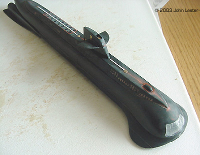 Two other inaccuracies I did not address. The hull forward of the sail is actually shorter than it should be. Another member in our club showed how he was correcting this, but I decided the effort was far greater than the results would be worth - for me. Also, the pattern of windows (vents?) just aft of the large "picture window" on the bow is incorrect. I could not see a way to fix this without major surgery, and that was also more time and effort than I wanted to invest in the project. Further Assembly The rest of the kit went together fairly well. The only major problem was the area around the main observation window, and spot light. This took 2 to 3 applications of super glue and glazing putty to fix. I ended up replacing the spotlight itself with the dome of a clear LED. The observation window piece was painted black and the frames separating the window panes was cut from decal sheet painted the upper hull color. Painting The instructions are very vague on the colors for the Seaview. The main color of the ship is given simply as "blue". After doing a little research on the internet, it appears certain that the filming miniatures for both the movie and TV show were painted with a darker gray on top of the sub and a light gray on the bottom of the sub. |