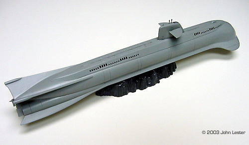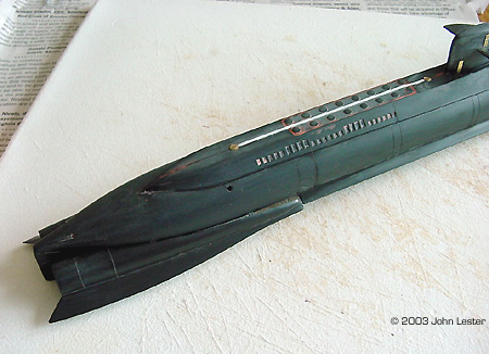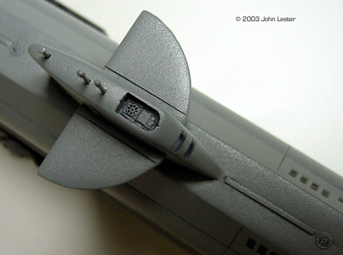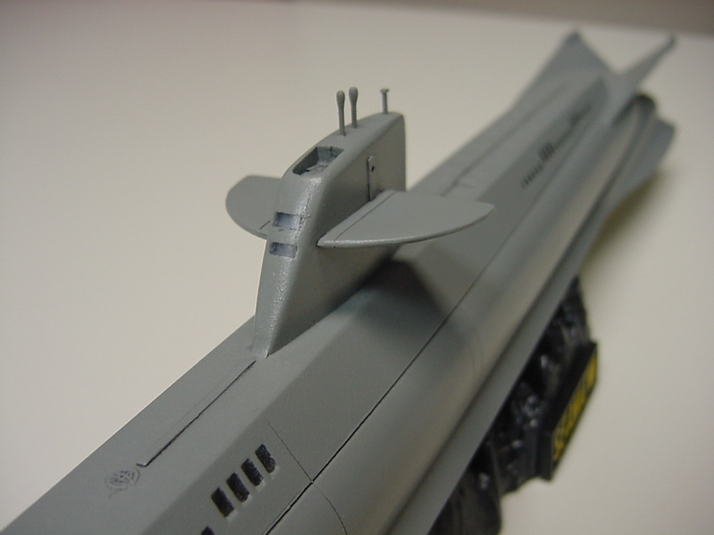 Image: Engraving & putty, aft half Image: Bow, under construction Image: New doors on the sail from scrap PE ^ New details on the top of the sailImage: Completed sail Image: Stern Image: New Flying Sub hatch ^ Closer look at the "picture window" |