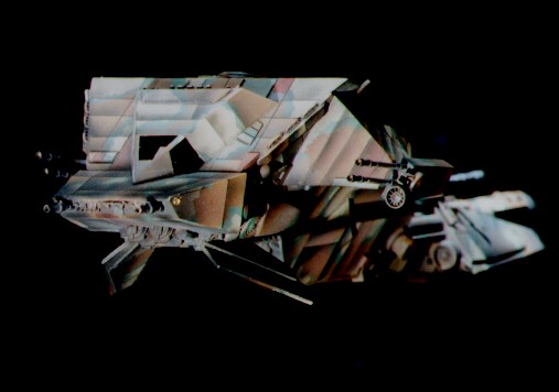 | By John Douglass - images and text © 1997. This ship actually started off as something quite different. It was originally supposed to be a very large freighter facing the other direction. It languished unfinished (alas, a not uncommon fate) until Shadows of the Empire, the LucasArts game, rekindled an interest for me in smaller potential "bounty hunter" craft. Anyway, in construction it is fairly typical for me. I started with two sheets of .060 styrene (plasticard). I cut one to look like a thick, stretched-out "Z", cut the other to match, joined them along the bottom, then plated-over a couple of the upper surfaces, forming what looked from the front or back like a fairly thick wedge. The nose was another wedge. I glued the front edge together, plated-over the sides and back, then sanded-off (with my disk/belt sander) the front edge. The wide part of the top of the ship would look really silly if I didn't put something on it so that it would look like it was wide for a reason. So, I put wedge-shaped "shoulders" on it, from which stuck-out wings. That was on the original freighter, anyway. When I picked this ship up again I plucked the wings, tucking them instead under the "chin". If you squint just right the ship looks kinda like a prehistoric fish from the side. Yes, even when sober. Well, sometimes. Anyway, the shoulders needed an excuse to exist again, so I made them turret mounts. Most ships have vast expanses of relatively little detail, with a few areas, usually nooks and crannies, with lots of detail. In order to make the top less boring I "indented" a square section of the top, then packed it and the surrounds with some detail. Enjoy playing "pick the parts"! The rationale behind the finish was I wanted a lander that was one of a large contingent on a carrier-type vessel. This particular lander is camouflaged for a, well, brownish-green planet. What doesn't show in the photographs is that some of the panels are painted solid colours (look toward the rear on the side view), *and* in a similar camouflage pattern done in red and light-blue! As always, the variety of colours add a bit of interest to the ship surface, and (hopefully) lend a bit of reality to the subject. | Click on each image to see a larger picture - but be aware, these are BIG! ![]() Side View of Mantee-class Assault Lander. ![]() The essential wedge shape of the nose and the body shows up better here. Note, too, all the detail parts fetching-up into the joints between the various major components. ![]() Top view - look at that detail! |
