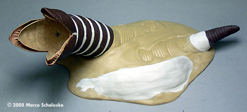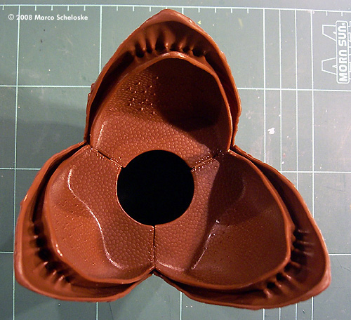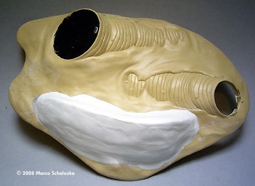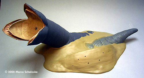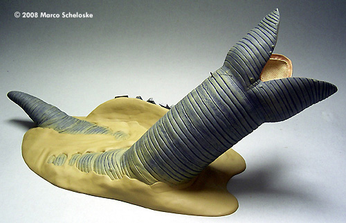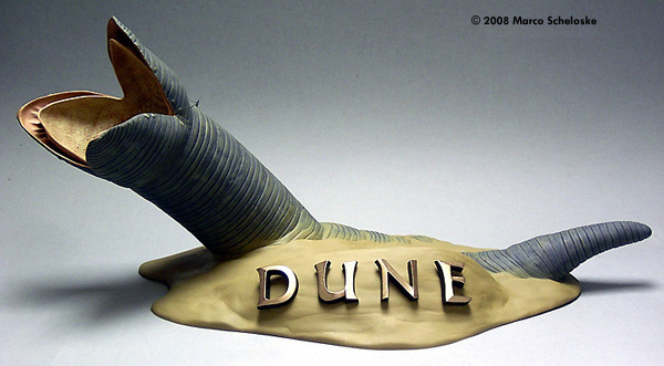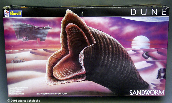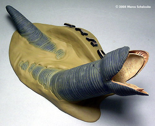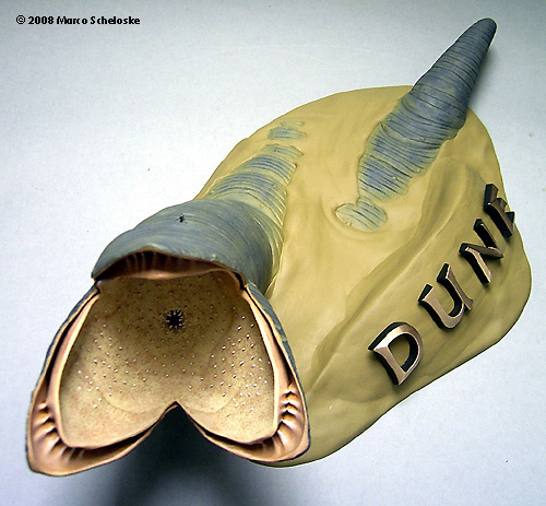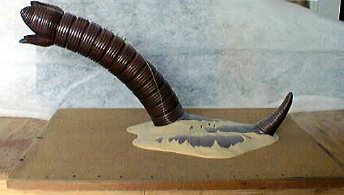By Marco Scheloske - images & text © 2008 I must not fear. Those lines, taken from the novel DUNE by Frank Herbert, are a perfect match to the old sandworm styrene model kit from Revell from 1984. Easy looking when you open the box you'll soon discover that it looks very, very strange when build as it is supposed to be. You read a review once about that kit, telling that it is crap? That review is right… So what is to do? Put it back in the box, and deep into the storage locker? No! Face your fear! Turn it into something special! That's what I did, and here is the story about how it was done. |