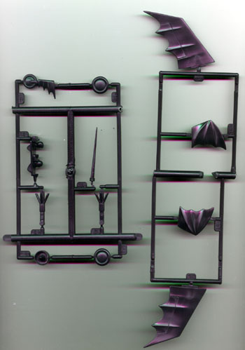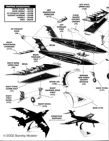 What You Get The kit is comprised of 21 styrene pieces (18 black, 3 clear) which make up the plane and a stand. An instruction sheet and a set of self-adhesive stickers for markings round out the package. Molding is quite good - I found only a couple of sink marks and some small mold seams on my sample. The kit is a faithful reproduction of the Aurora kit, so what you get is 1960's technology pressed in 2000's equipment. There's almost no panel detail, engraved or otherwise, just as on the original (just the outline of landing gear doors); exterior details (such as the thick, squared-off intakes and the landing gear) are clunky by today's standards. No cockpit or wheel wells are provided. Instead, you get a plate with Batman's and Robin's heads, somewhat pinched, sticking up; the landing gear plugs into holes in the underside of the model. I see this as an opportunity to excel - cockpits and gear wells are easily scratchbuilt for those that want more detail. I'd also use some plastic stock to blank off the intakes -- after thining their edges down some. Incidentally, the size of the Dynamic Duo's heads leads me to guess a scale for the kit at roughly 1/48th. That should greatly simplify finding pre-made parts with which to detail the kit. |