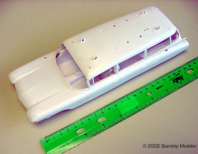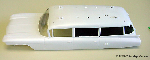What You Get The box is almost bursting with parts - clear, tinted, white and chromed plastic, plus vinyl tires, screws and metal axles. Instructions and a sheet of stickers complete the package. It's marketed as a Skill Level 1 Snap-together kit for ages 8 and up. The major features of the vehicle are present, but it's a curbside model (no engine, no separate chassis) and the interior is pretty spartan. Molding is pretty good, with no flash or sinkholes (on my kit, anyway) and negligible mold seams. It's very well engineered: almost all the chrome parts attach to the sprues in spots where you have to scrape off the chrome anyway if you're going to glue them on, for instance. The equipment that festoons the exterior is provided as separate pieces, which makes painting so much easier. The three clear pieces (flasher covers and windshield) are clear and distortion-free, as is the tinted piece that covers the back windows. Instructions are typical for Polar Lights - not great, but most folks will be able to puzzle through them. Paint call-outs are provided, but to get the details right you'll need to compile some references. The stickers provided give the "No-ghosts" logo for the doors and hood, license plates and red for the fins. The logos are OK, but the license plates are the wrong color and I'd skip the fin markings - it's just as easy to paint those on. Missing are a whole bunch of dataplates, guages and warning stripes for the equipment on the roof, as well as dashboard instruments and such. The Ecto-1 and Ecto-1a (Ghostbusters II) were both constructed from 1959 Cadillac Miller Meteor Combination End Loaders and are both housed on a Sony backlot as of this writing. The model appears to be pretty faithful to the original Ecto 1. Where it falls down in accuracy is the in all the gadgets and equipment lashed to the roof. The major details are there, but vastly simplified (for good reference images showing this, see the Ghostbusters Prop Archive). Also missing is any of the equipment (like proton packs) normally stowed in the back. While the hard core modelers out there will no doubt provide a market for aftermarket resin bits (those that don't scratchbuilt the whole assemblies), the folks targeted by Polar Lights will most likely be happy enough with what is provided. Assembly & Finish Fit of the major components is pretty near outstanding. I dry-fit most of the larger pieces and was very impressed. I'd use glue to make sure things stay together though. While I'm sure the stock kit can be built up to make a nice-looking desk model, you can really make the car shine with a relatively few additions. Fill up the inside with equipment -- you won't see details through the heavily tinted "glass", but you will be able to make out the shapes. The roof rack looks to be scratchbuilt easily enough from styrene rod and sheet; you can remove equipment from the kit part and go a long way towards filling the new structure up properly. Conclusions I like this kit, despite it's shortcomings. It's something that will appeal to my 7 year old neice as much as it does to me - and we can both built it to our individual levels of experience and be happy. Furthermore, the low price lets me rationalize any aftermarket accessories I may end up acquiring. Recommended to any who have the interest in the subject. |