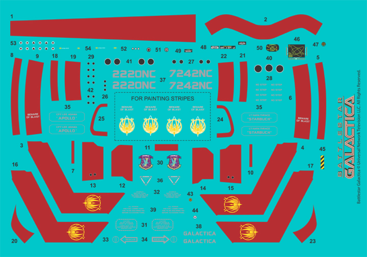 The kit may be built with gear up or down. The (provisional) instructions make reference to separate parts to show the landing gear bay doors opened or closed. The sample I have did not have the closed gear bay door parts. The undercarriage parts themselves are nicely detailed though there is no detail in the gear bays. There's an opportunity for scratch builders (especially since it was never shown on screen, so nothing you do in there can be “wrong”). After you trap the cockpit and nose intake parts between the fuselage halves, and affix the bottom fuselage plate, it's time to assemble the wings and engines. The instructions lay out how to do this. Everything slides together in such a fashion that the parts are mutually reinforcing. I'd suggest you paint the inner structure of the top engine before assembly - it will be hard to do so later. Same with the rear plate (afterburners and rear deck). The decals provide markings for two ships: Apollo's and Starbuck's. Decals include stripes, RCS thrusters (I'll drill these out on my model though), cockpit instruments and pilot uniform patches. You also get separate wing and exhaust markings to use if you decide to paint the stripes (AztekDummy is coming out with a vinyl mask set to help you do just that). If there's a fault with the instructions it's that the diagrams and photos are too small - but that may be an artifact of the pre-production sample I have. Otherwise, they are pretty comprehensive. Drawings and pictures of the kit walk you through assembly. A paint chart keyed to Testors' brand paints gives you colors. They look to be accurate enough. Conclusions If this pre-production piece I have is any indication, Moebius have a real winner in this kit. Detail is good. Fit is good. I'd like more options for pilot markings but the aftermarket will have those by the time I'm ready for decals. I may well end up with more of these kits than I have Starfuries --- if only just to recreate the scene where they launch from Colonial Movers on the ceiling of my man cave .... Highly recommended - I can't wait! |