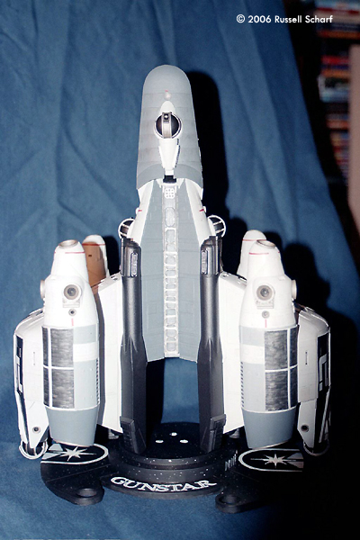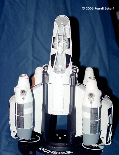 Little did Alex know that he was in fact being tested, and would soon be millions of miles away from Earth facing the ko-Dan Armada in the very last Starfighter. Overall Impressions This is a great kit but I wish it was a little less expensive. Is it accurate? It's really close! The design and the overall shape are perfect. However, some areas and details need work and can be made to match the original relatively easily. The resin is really easy to work with. If you plan to modify the kit you'll be surprised how fast you'll have a pile of resin dust.What You Get The kit comes in a very sturdy box and the parts are packed really well, with most wrapped in bubble wrap. The small parts like the seats are in bags and the rest are packed tightly in styrofoam packing peanuts. This kit has 40 detailed Gunstar parts, plus 4 brass rods that you are supposed to bend into the aft guard rails to protect the aft ball turrets (the instructions have a template showing how to bend the rods into the correct shape). Also in the box are 3 clear acrylic rods with which to mount the model to the base provided. I found out that the rods were cut uneven when I got them, I ended up shortening them and making sure that the rods would match up to the angle in the base and keep the model from swaying (back rods 6 1/2" and the front rod 7 3/4"). The last resin part is the Base which is shaped like the outline of the heads -on view of the Gunstar. Also in the box is a picture of the "suggested" paint scheme for the Gunstar. Assembly I followed the instructions basically just to see where all of the parts go. I had a little problem attaching the gunpods (wings) to the hull. They wouldn't fit flush to the hull. To make sure that the gunpods would have the correct curve at their roots, I wrapped sandpaper around a small spray can and sanded from the center to the outer edge. I also had a little trouble attaching the engines to the mounts on the gunpods, There are indents in the mounts that are supposed to match up to the pins on the engines, but not all of them would match up to each other, so I ended up making a pattern out of one of the mounts to make sure that they all would be equal length to each other. I ended up not using one piece that looks like two framed-out monitors that's supposed to go in front of the Starfighter's (pilot's) chair, what looks like where the instruments are in any of today's modern combat aircraft. I also decided to remove and rebuild the rectangle area that looks like air vents. I then modified the chin armor which protects the Starfighter's side windows. I ended up removing a lot of resin around these windows; there were a few holes after I moved the side windows in. I deepened the area around the windows as well. I found a easy way to fill holes in tight areas like around those windows that worked well for me: Superglue-covered tracing paper. After the superglue cures just putty over the area and you can't tell there wasa problem! I did this instead of filling the hole with putty since the hull is hollow and I didn't think I would have enough putty for the whole hull (plus I didn't want the putty to damage the Starfighter's chair well!) The Starfighter's seat has 2 parts, an outer ring and the seat that you are supposed to just attach to the corner edges of the the ring, but if you watch the movie you'll see that is not the Starfighter's seat. I made spacers for the seat and reworked the controls' shapes and colors for both Starfighter and navigator's positions. I also reworked the Navigator's seat. WARNING! While you are cutting out the navigator's area you can accidentally remove the top edges leading to the pilot's (front) area (I had this problem) where the canopy rests. Luckily, the edges can be easily fixed. After I attached my canopy I filled the area with Microscale Industries Micro Kristal Klear, which fills the area well and can be painted over. I also used kristal klear to attach the canopy. In front of the cockpit, I dug into the flat circle radars to make the correct concave dishes. After I attached the gunpods (wings) and before I attached the engines I decided to attach the thrusters. I found an easy way to get the thrusters to all point out at a 45 degree angle to each other. There's a line running in between the big solar panels and a grid inside the thruster. I just drew a line in between them to get the correct angle. Now to the weapons. The ball turrets ended up being the easiest to modify. I filled the area where the barrels are with putty. The barrel was taller than the rim so I just cut off the excess.After sanding, I hand-drilled out the barrel with a sharp x-acto #11 blade. The other guns that sit in front of the landing gear were a little harder to modify. I worked down the flat area near the barrel and where the curve ends I just followed the edge around to the barrel. I cut the box in front of the barrel down to just three thin walls, with the missing wall facing away from the barrel. I then removed everything inside the walls all the way down to the top flat part of the gun. Now there were just a few things left. When you see the gunpods for the first time in the movie, where the Death Blossom Doors are you'll see bars running down the length. Only a little area around the missile barrels is all that is actually present. There's a picture of the Gunstar 1 that I got off the internet that shows a shadow cast down the length of the doors from the missile barrels, and I could see how the molder of this kit would mistake that shadow for a door length bar. And there are two small rectangular boxes on the model's starboard gunpod but that is where red markings go instead. I also changed what I guess are smoke vents at the top of the doors. The other area that takes some work is the bottom (ventral) hull where the Starfighter's windows are. You can see a mark on the bars running the length of the lower hull; I made a channel the width of the mark all the way down a