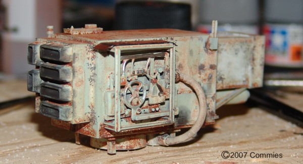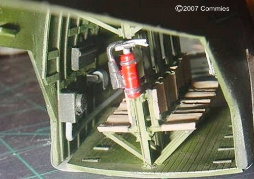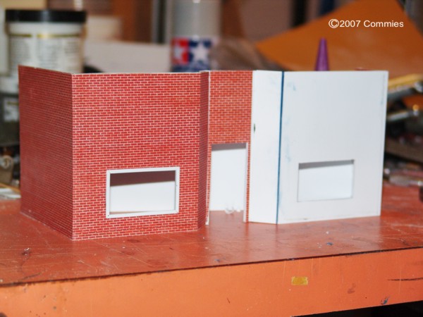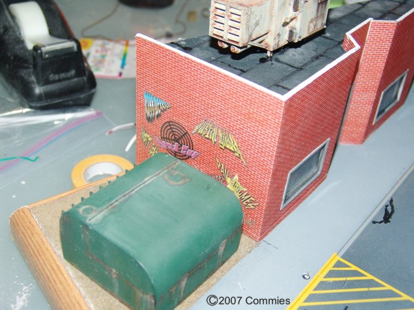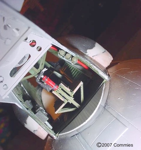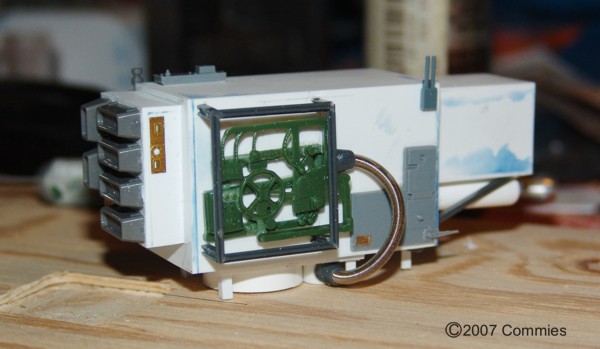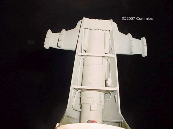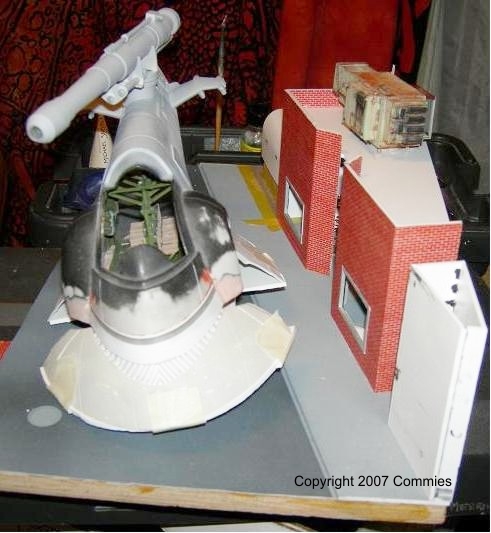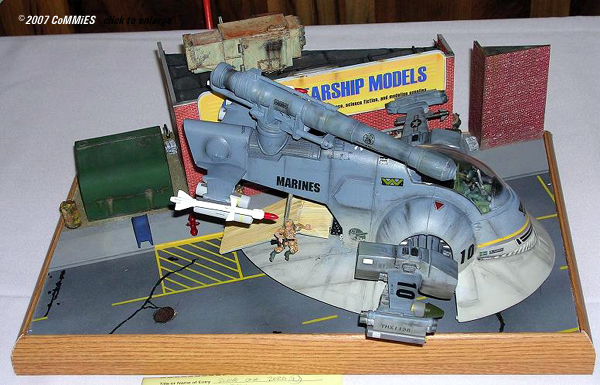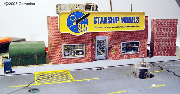 This massive project began in the minds of me, Justin (Bluesman) Miller and Robb (Kylwell) Merrill in the summer of 2004. This article will chronicle the exciting journey of a model project that became much larger than we had planned, brought a group of guys together now known as the CO.M.MI.E.S. We also made John and Linda feel pretty good, which was the whole idea. Genesis The Commies all met through Starship Modeler. We started in Denver, expanded east into Kansas and now have agents all over the United States, Scotland, England and Australia. You don't have to be from Colorado to be a Commie. And this isn't the only club within a club. The Techmages, Florida Peacekeepers, and PINKOS come to mind as well…all having strong roots to Starship Modeler. Robb and SueAnne made the trip to Wichita that fateful summer of 2004 to see the Cosmosphere Space Museum and do some shooting at my dad's ranch. We may have talked about models too. In fact, I am sure we did. Robb and I were sitting in my living room talking about models and I presented Robb with the idea of doing a cool project for John Lester. Our goal was simply to put a smile on John and Linda's faces, but by the time this adventure was over we found we did much more than that. My concept was to do a Slave One, but make it a Marine gunship of some sort. Robb was very receptive to the idea and we began talking about how to execute it. It was originally going to be just the ship, and simply mailed to SM HQ with a thank you note. We wanted to do something nice for John and give a little something back for everything he has done for us on the Starship Modeler site and show respect for his service to our country. Then Robb had the idea to do a diorama and brought in the concept of having the ship landing in at the Exec West parking lot with space Marines assaulting the hotel. I liked the concept. If memory serves, I was going to do the ship and Robb was going to do the base. We talked about it some more and left it at that. Getting Started The first step was locating an AMT Slave One kit. I mentioned the project to Matt (M3) Jacobson and he happened to have a spare Slave One kit in his infamous Studio of Doom. So the journey begins. Matt writes: My recollections? I believe it was Justin's idea. Mostly, but I could be wrong. Justin came up from Wichita to go with me and my sons to the annual Kansas City IPMS show in September. He told me about this crazy idea he had. All he needed was an AMT-Ertl Slave One kit to get the party started, which back in the halcyon days of 2003-2004 was a rare commodity indeed. Before the AMT re pops and the Fine Molds release. Fortunately I had a couple of those kits (always buy spares, you know) in the Closet of Doom, now the Studio of Doom). My primary contribution to the Great Project was supplying the base kit. And yes, it was a fairly rare kit at the time. It's not my fault that these slo-mos took so frellin' long to finish it that there was a re-release and subsequent Kaybee Toys sell off of the selfsame kit in addition to the release of the Fine Molds kit in the mean time. Little did I know what the other comrades had in store for her. I am not sure at what point things got out of hand, but the project got bigger and bigger as new ideas were introduced. The project soon became bigger than me and Robb could do ourselves. Robb brought Dan (Jonas Calhoun) Holmes and Brad (Mr. Badwrench) Guy in on the project. Soon after Jeremy (Sgt Pinback ) Schwinck was in on it too. Hal (Roguepink) Bierman came aboard also. I was elected the project coordinator and tasks were assigned according to each member's area of modeling expertise. Robb took the street and store diorama portion. Dan and Brad did the extensive modifications to the base kit, which included rescaling it to a 1/48 scale to make use of stock figures. Dan and Brad also worked on the lighting and interior. Matt provided the donor kit and consulting. Jeremy built the engines and weaponry and Hal made up custom decals. Of course with a team build there was some crossover in the duties. I was to paint, weather and decal the beastie. Dan, Brad and Robb were all in the Denver area. Jeremy was in Salt Lake City. Hal was in Colorado Springs. Matt and I were in Kansas, but I would be moving to Georgia shortly after Wonderfest 05. By then I was wondering what have we gotten ourselves into and if we really could do this. During the project we decided that replicating portions of the Exec West hotel would be difficult to make convincing. Since the final site of the diorama would be in Chicago, we thought it would be cool to do our version of a Starship Modeler storefront. The goal was to have it ready by Wonderfest 2005, but as time went on the project got bigger than all of us. There were unforeseen challenges and setbacks along the way, but we had a very dedicated team. We decided as WF 05 approached that it would be better to take some time and do it right than rush it and mess things up. We also wanted to put our best efforts into making this a great piece to give to John. We also thought if we could have it done by WF06 that that would make a great present for John and Linda on the 10th anniversary for Starship Modeler. We talked in secret about the project at WF05 with strict orders not to discuss what Robb began calling PSOZ (pronounced Pee-Zoz) in public. I pretty much let the guys do whatever they wanted. All I really cared about was that they give it their best shot. My job was to keep everybody on task and motivated until my end of the project. I would get reports sometimes frequently, sometimes infrequently and an occasional picture or two. At times I wondered what the rest of the guys were doing. As reports came in new concepts were added. Some worked some didn't. We also got the idea to throw in a lot of in-jokes and wanted to put a lot of detail into the project. Robb's work on the HVAC unit on top of the store is practically a contest winner on its