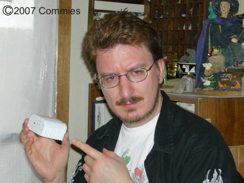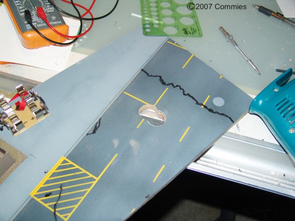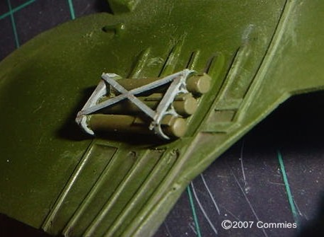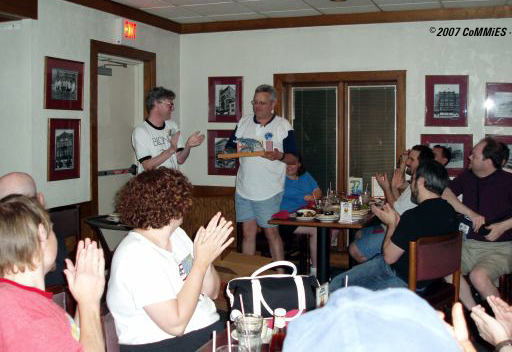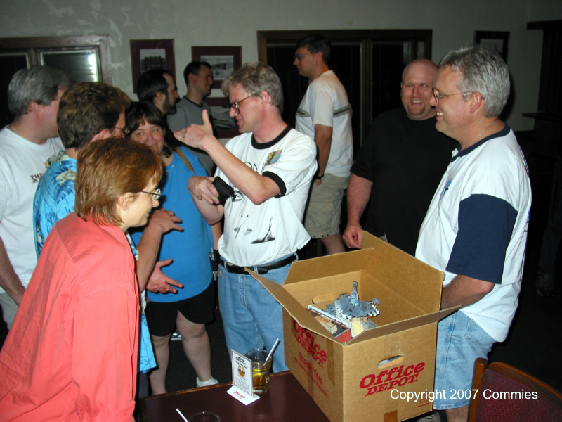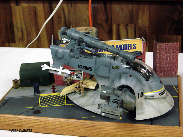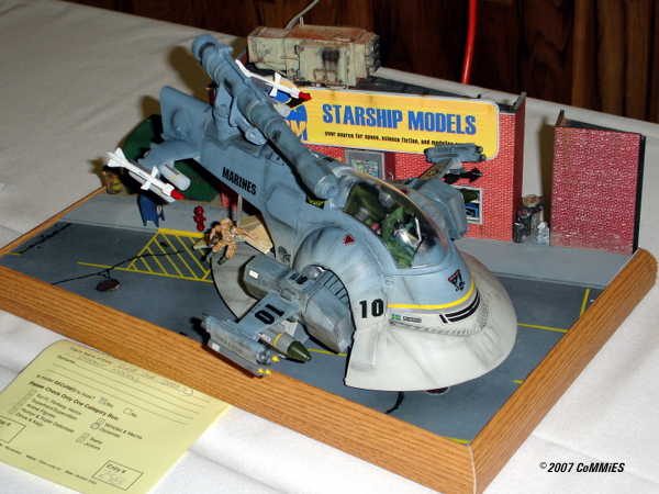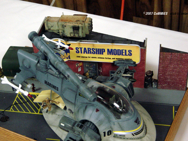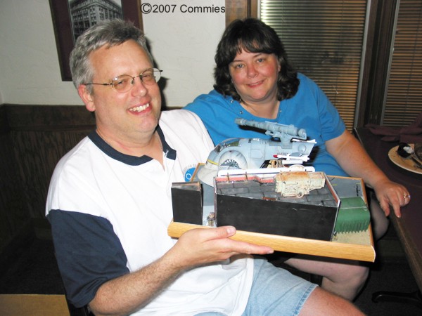 I emailed Linda and was discreet about asking what ship John served on while he was in the Marines. Linda told me it was USS Wasp. I found the Wasp's logo on the internet. I also modified an Enterprise MACO logo, replacing Enterprise with the name Wasp. The decals arrived from Hal via Robb. One look at the sheet had me cracking up. In addition to Marine markings there were more jokes. The SAAB grille was a nice touch. I later found out Robb did that one for me. I have a thing for Swedish cars, and John has a Swedish heritage. I decaled and weathered the hull, then boxed her up for the trip to Kentucky. When I arrived at the Commie suite on Friday, I got to see the street and store diorama base that Robb had done. We had to use some strict security precautions as we had to add weapons and figures in the suite. One of the first visitors was actually John Lester and we scrambled to hide the model from him. We also had to be very careful to not talk about the project outside the room until the model was on the contest table. Once the threat was over I was amazed at all the stuff Robb put in the scene…little packages of kits we'd love to have, but will never be made in the window of the store. And our signature was graffiti on the side of the building. We were going to do a series of posters like a wanted poster of Dan, a Blues benefit at the Mt. Prospect Police auction and a blockbuster film directed by Matt. The graffiti works much better on the bricks. There were also glowing red eyes of C.H.U.D. peering underneath the manhole cover. Jeremy worked on attaching the weapons. Brad went to work on the figures and noticed something was missing. The crew ramp was detachable for painting and transport, and I had left the entire ramp assembly back in Atlanta. Brad just happened to have some tube stock and sheet plastic on hand. Brad and Matt went about rebuilding the ramp. The last touches were adding the figures and ordinance. At last the model was done, but the adventure was far from over. We packed up the model and hid it in our suite. Secrecy was of the utmost importance and we had several “guests” stopping by our suite. There was more we wanted to do, and ideas that didn't get in the final version like Brad's FLIR pod, but there comes a point where you have to call it done and walk away. Matt writes: Since I provided the base kit that got the ball rolling, it seems fitting that the only piece I actually built for the SL-10 project was actually on of the last pieces, if not the last piece added. In his mad rush to get to Louisville, Justin forgot a few parts to the model. The parts were for the crew ramp. Luckily, Brad had brought some perforated sheet stock and the exact size aluminum tubing that he had used the first time around on the model. I was able to quickly scratch up a replacement while final construction and systems integration was going on in the other half of the suite. In addition to rebuilding the crew ramp, and participating in the first Iron Modeler, Matt pulled an all nighter on Friday and kitbashed a Viper X wing hybrid. Wonderfest On Saturday, the Commies were putting final touches on their individual entries for the contest. While we were filling out our entry forms, Robb slid a form over to me and told me to fill in the info on SL-10. I called the project “Slave One Zero at Starship Models”. I wanted to put all the team on the form, but everyone told me since it was initially my idea to put my name on the form. Robb transported the model to the contest room, and the Commies made a ring around Robb sort of like the Secret Service does with the President. The idea was to have minimal people see it until it was on the contest table. On the way to the contest room, we once again ran into John. John said very casually, “Hi, guys.” The Commies responded, “Hi, John” It appeared that he didn't see anything and we really didn't stop to chat. We all were asking each other if he saw anything. We made our way up to the contest room and set the model in the diorama section. We then went to enjoy the day making laps around the dealers room, attending demos and presentations and having a great time. Throughout the day, as people approached John and Linda at their booth, they asked them if they and been to the contest room and seen the project yet. John and Linda were working their table so it was hard for them to get away. As the day went on more and more people were telling John and Linda about it. Word was getting out fast. The Commies went around all day just agreeing with people that it was a cool model, but not really admitting to being involved with it. If anybody did trace any involvement back to us, we denied it, just like on Mission: Impossible. During the pool party, someone informed us that the Commies needed to get up to the contest room because John and Linda were checking out the model. The Commies slipped away from the pool party one by one and we casually walked into the contest room and acted like we were looking at the entries, while in reality were observing John and Linda. We congregated at the opposite end of the room, and then slowly made our over to John and Linda. It wasn't until I read Linda's article on Starship Modeler shortly after Wonderfest 06 that I found out about the emotions we had stirred up. Linda said she wanted to hug us all, but couldn't because she was tearing up. I didn't realize we'd caused that kind of reaction. John was teasing us about it all through the rest of the pool party. While we endured John's ribbing, as people found out who was responsible for the model the Commies received a lot of positive comments about it. It was time for the contest awards. The Commies wanted to win something for Slave One Zero, but if it didn't that was okay. John and Linda enjoyed it and all the positive feedback from fellow SM members was enough. When Dave Hodge announced that Slave One Zero was awarded a bronze in the diorama category, it 