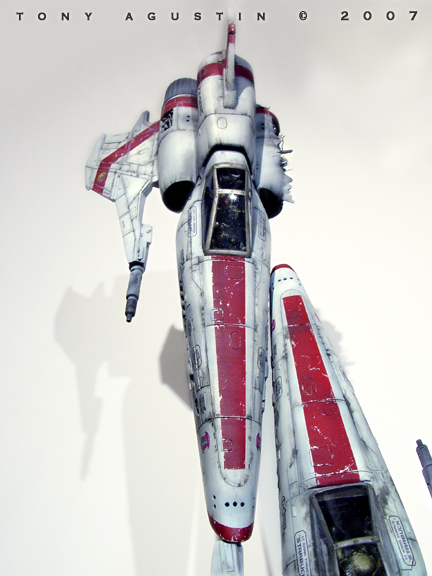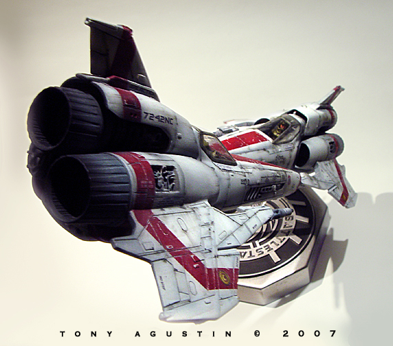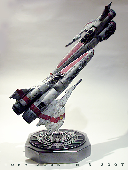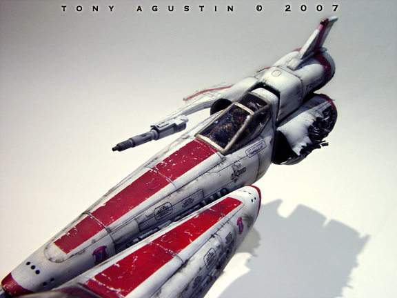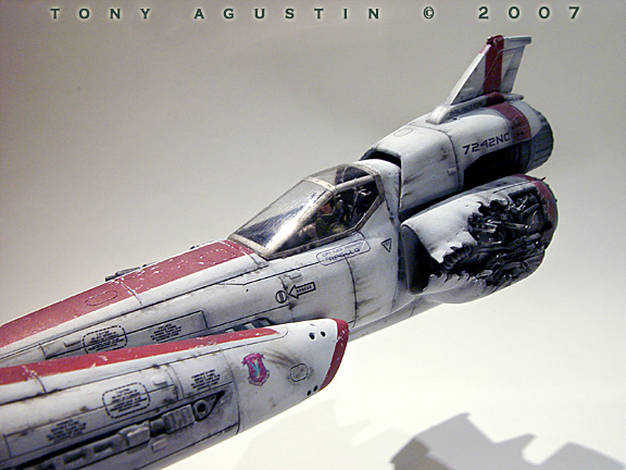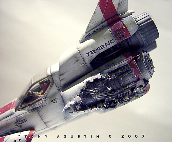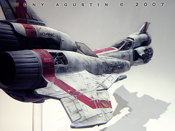 By Tony Agustin - images & text © 2007 Lee "Apollo" Adama has no hope of getting back to the Galactica. Trapped inside of his severely damaged Viper he accepts the possible fate of either capture by the Cylons or a slowly suffocating in the cold of space inside a dead fighter. However his pal Starbuck has other things in mind for Lee, as she comes up with a 'unique' rescue plan of her own. Performing a reckless yet necessary maneuver of physically attaching her fighter to his and 'flooring it' , she successfully gets them both back inside the Galactica's port flight pod just mere seconds before it jumps safely away from the attacking Cylons. The Vignette Back in 2005 I got a chance to purchase online from Sci Fi Models a pair of 1/48 scale Viper MK 2's mastered by Alfred Wong. I believe as of this writing Alfred has re-mastered the 1/48 Vipers and they will eventually be sold thru the Starship Modeler Store.) (That is correct - Ed.) |