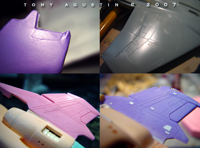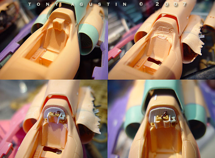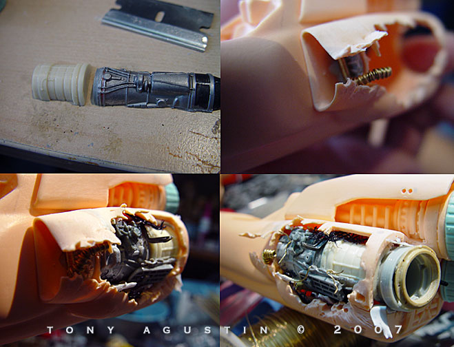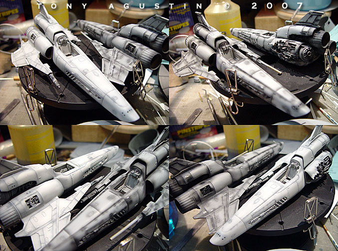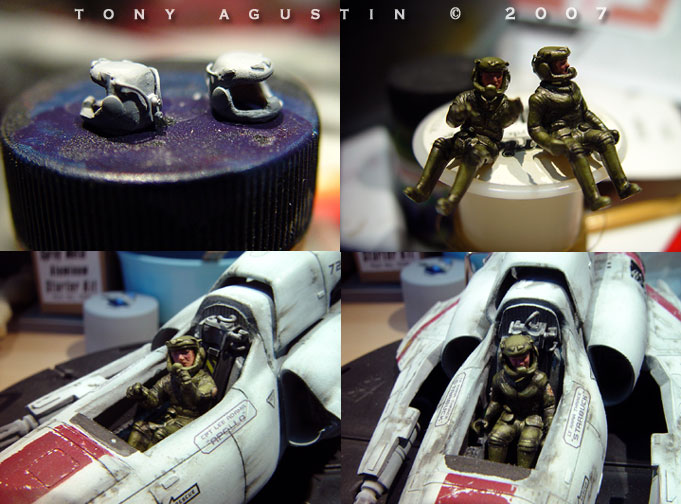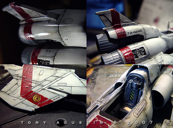 ^ Damage Image: The resin parts provided in shockingly yummy-licious colors. Image: I used DVD screen grabs for reference to replicate the damaged Viper MK2. Image: I beat up the port engine area ... Image: ... then bashed an engine and other internals. Image: I opend up the access areas on the engines and replaced them with a cast resin part of an X-Wing engine. Bits of kit parts and brass wire was used to decorate. Image: I tore up the kit cockpit with a sprue-cutter and dressed it up using reference from the internet. Image: Some subtle and not so subtle cosmetic changes were made. Image: A wing from an F-15 kit was used as inspiration for the new MK2 paneling. Image: A mount was devised using aluminum/brass tube and acrylic rod. Image: More details Image: Mock-up Image: Assemblies are washed and dried for priming. Image: Plasti-Kote Primer is my friend. Image: I take my Sotar and Pre-shading begins. Image: White Plasti-Kote is misted on to kill the high contrast of the pre- shading. Image: I ditched the decals and ended up painting the stripes on. Easy Peasy. I scratched away at the soft acrylic paint to show chipping. Image: For weathering I use Acrylic Enamel 'Grime' and 'Flat Black' in controlled washes and stipples. There is some rust in the mix but it is used very sparingly. Image: The canopy was kinda crude on the surface but with a little wet sanding and Future it can look a little better. Image: I also used silver pinstriping tape to replicate the canopy frames. Image: I make my own decals when the kit provided ones won't do. Image: I sprayed the surface of the area to be decalled with Future and hoped for the best. When the decals were finally laid down, Gunze Sangyo clear flats were used to dull everything down. Image: I hollowed out the helmets with a Dremel tool. I then tried some creative head transplants by sacrificing some 1/48 russian figures. Image: The tops and backs of the russian heads were trimmed so the helmets could fit. I also detailed out the little helmets with scrap styrene and brass wire. Image: The figures were primed and painted with Badger Freakflex colors. Image: Completed vignette Image: Looking down Image: Damage Image: "What the hell?!" Image: Lee's fighter Image: Another look Image: Closer Image: Other side |