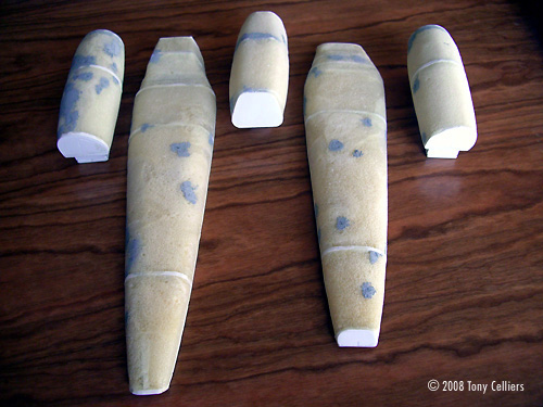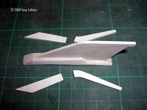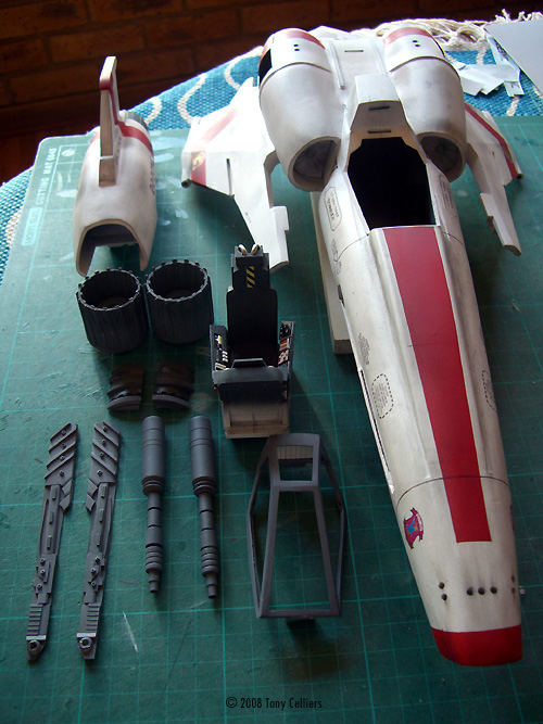 ^ Getting started: styrene and foam blanks Image: Joining the vacuformed fuselage halves Image: Adding the raised nose detail Image: Main engines joined Image: Recess for exposed engine detail Image: Rear fuselage detail affixed Image: Upper fuselage closed .... Image: ... and the lower ^ Starting the bottom extension Image: Blending it together with putty Image: lots of sanding ... Image: Landing gear pods Image: Pods in place Image: Main engine components ^ Engine details Image: Outer details in place Image: Inner detail ^ Upper engine components Image: Base for the top engine & tail Image: Ready for the engine Image: Image: Components assembled ^ Engine detail inside the top cover Image: Side detail being affixed Image: Done ^ Tail fin Image: Recessed engine detail parts ^ Adding detail to the engine recesses Image: Detail for the nose insets Image: Primed ^ Cockpit components Image: Cockpit tub Image: Rear bulkhead Image: KEW Image: Bottom/rear thruster outlets Image: Main wing parts Image: Wing to fuselage Image: Canopy construction Image: Wire details for the engine recesses ^ Completed cockpit tub Image: Components, painted and detailed Image: All together Image: Primer applied Image: Base color coats ^ Striping Image: Cockpit in place Image: Tamiya Weathering Set B - good stuff ^ Decals and weathering completed |