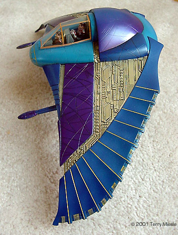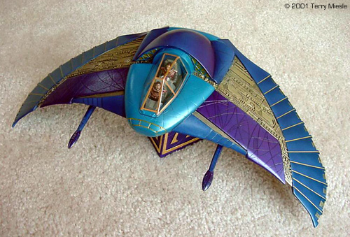 It is a show which “gets it right.” It uses many of the same stories familiar to SF and drama series, but does them better than most other shows. I recommend you watch it when you get the chance. The premise of the movie and series was simple. All those gods we believed in were actually living entities, but they’re not gods, just very powerful aliens. Most are still alive. The Goa’uld and Tokra are symbiotic life forms, similar to the Trills in Star Trek, but with an attitude. The Goa’uld are universally evil, taking the form of gods using technology to dazzle and enslave less advanced civilizations. They dominate their subjects and use them for nefarious purposes. The Tokra are also symbiotes, but are at war with the Goa’uld, and are fairly obnoxious in their own right. The Asgard are another ancient race, typical grey aliens, and are also at war with the Goa’uld , though these guys are more benevolent. The Goa’uld are at war with one another too, as though they didn’t have enough trouble already. Ship design does not play a primary role in Stargate. The capital ships of the Goa’uld are generally Egyptian looking, featuring pyramids as a basic shape. The Goa’uld employ a number smaller craft, including this Death Glider. It is armed with a pair of main guns which are larger versions of the hand-held staff weapons used by the Jaffa. These fighters are capable of operating in atmosphere or vacuum, and are highly maneuverable. They apparently use the same gravity drive as the other ships in the series. The Model Warp has a winner here. The casting is crisp and details are very good. There were few pinholes, and a minimum of flash or mold lines. The fuselage is cast as one hollow piece. The half-figures are nicely sculpted and well cast in soft white metal. You'll have to decide for yourself whether you want to build them into full figures and scratchbuild a full cockpit or just paint the floor black and ignore it. The bad part about all of that is the resin WARP uses. The mold release was very strange stuff, it seemed like petroleum jelly and smelled of honey. This required dish soap and a toothbrush to remove, which did grind into the surface a little. It is GRP resin, a polyester, with microbubbles included to extend it. This meant that when I sanded any area, including removing mold lines, hundreds of tiny bubbles were exposed, which had to be filled as well. Exasperating. I had to do a lot of filling with Gunze Mr. Surfacer 500 and 1000 (fill-n-sand) and I used a sandable primer from Krylon. This let me fill the areas, sand, fill, sand and even sand the entire model to a good surface. To say the least, that part of the building was very frustrating. The cockpit tub and the guns were cast in good resin, light tan polyurethane. These were very nicely done. The canopy was cast in tinted translucent resin. One copy I saw was a pretty cool light purple, the other a dark blue. Both canopies I saw had major problems due to the mold release - it actually left indentations in the surface! Additionally, there were pits and bubbles in the clear resin, not good. I polished the blue canopy until it was relatively clear. Then, while cutting off the excess resin, I broke it. After considering scratchbuilding a canopy framework I decided to heat smash a new canopy over the remaining one. I slathered the intact purple canopy with Mr. Surfacer 500, sanded and polished it smooth. Using that as a positive master, I heat smashed a new, clear canopy. This was polished and coated in Future. More work than I wanted, but the clear canopy is better. The glass in the series does have a tint, but I think it's more like a Chevy Lumina minivan's glass - metalized or polarized. Strips of Bare Metal gold foil is the framework color. I primed the model with sandable primer as I said earlier. This was wet-sanded smooth and primed with white paint. After priming, the painting of this kit is an exercise in pearlescent paints. I used Testor's Acryl Pearlescents: True Blue, Deep Pearlescent Purple and Grape Pearl, and mixes thereof. Additionally, for the "feathering" effects I darkened the base color with Tamiya smoke and for the pretty light blue, I added silver and white paint, making it slightly more opaque as well. Most entertaining, even with all the masking. The gold areas are Testors Acryl Brass. This color matches the gold parts of Goa'uld ships almost perfectly, and using two coats covers even darker backgrounds very well, I was pleasantly surprised. The fine gold lines you see were applied using a cheap gold ball point gel pen obtained at Michael's Craft store. It can be wiped away with a moistened finger and completely removed with an alcohol swab. Do this over a protected surface; I had about 3 coats of Future over the entire model when I did this. The large gold detail areas were washed with black oil paint to bring out highlights and increase contrast. |