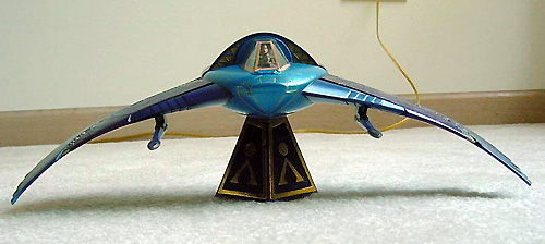 The figures were painted using whatever paints seemed useful. They’re superglued in place. Bare Metal gold foil was used to frame the canopy. Dip this in Future to permanently affix the foil. The canopy was attached with white glue. The model also includes a small stand with the symbol for Earth in relief. Conclusions: When finally done, this is a large model, with a wingspan about 16 inches. It’s very colorful and well-received by viewers. It’s $110, which is a pretty fair price for something this size. My only real complaints are the mold release agent, that awful microbubble-filled polyester resin, and the clear resin canopy. Vacuform the canopy and get a handle on the mold release, WARP, and you’ll make people much happier – they’ll even put up with the GRP. Perhaps I’ll build the USAF retrofitted version next…anyone want to give me figures of Teal’c and O’Neil? Many thanks to Federation Models for the review sample! |