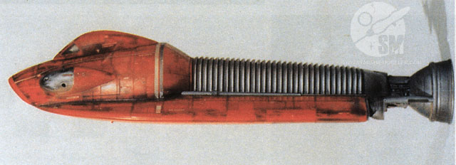 IMAGES: | SHADO's first line of defense against attacking UFOs was Moonbase (which is rumored to be the precursor to Space:1999's Moonbase Alpha - in fact Space:1999 began life as a UFO sequel!). This outpost was defended by a variety of weapons, such as lunar tanks. But clearly it's strongest anti-UFO punch came from its Interceptors. Housed in an underground hanger near Moonbase, these could be scrambled at a moment's notice (see picture to the left). The Interceptors were single-shot missile ships. Their bulbous nose was actually a proximity nuclear warhead which could be fired at advancing UFOs. Unfortunately this meant that once their missile was fired, they were defenseless. This is not a good thing, given how many times they missed over the course of the series. The Interceptors were strictly controlled from Moonbase. The pilots had little autonomy. | |