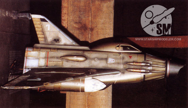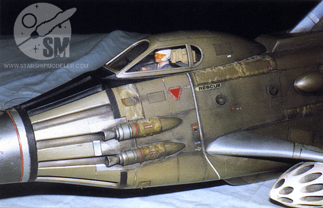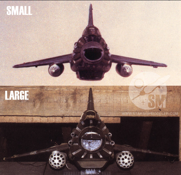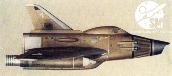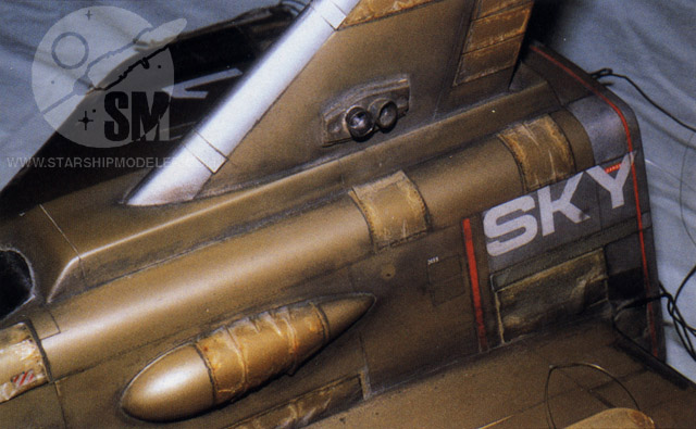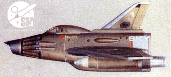 IMAGES: | Skydiver had about a four-man crew, with the captain usually serving as the pilot for Sky One, a twin-engine fighter. Its primary offensive armaments were two missile pods slung under the craft's small wings and four nose-mounted cannons. A boarding tunnel ran from the control room of Skydiver, through the back of Sky One and into the cockpit area. This way the craft could be quickly scrambled in combat situations. There were three sizes of Sky One used on the show: the two on the Skydiver models, and the larger one (though this was not much larger than the medium ones). The large one was specially made for flying shots (though the others did their share) and is made of the thinnest, lightest fiberglass possible. The larger model holds a little more in the way of detail. There are also minor structural differences between the two sizes of models, such as the gun pod caps. | |