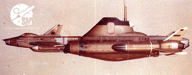 Skydiver was an advanced attack submarine operated by SHADO in their war against the aliens. The organization operated three such vessels, whose existence was top secret. The front part of the sub was an aerial fighter (Sky One), which could launched from beneath the surface of the water to maintain secrecy and use the element of surprise in ambushing UFOs already in the atmosphere. The Skydivers were berthed in underground docks (in Britain and presumably elsewhere), linked to the sea by long tunnels. |