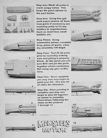 The Kit: The kit, produced by Monsters in Motion, came out of the box very clean, with crisp castings that are completely devoid of air bubbles and mis-aligned mold halves. There is a minor amount of flash on most of the parts which will be easy to clean up. On the larger parts, there is an obvious lack of seam lines, and among the smaller parts, they lay along corners or are hidden from view after the model is constructed. The majority of the parts were cast hollow, and as a result the model weighs considerably less than a comparably sized, solid resin kit. In my opinion, this is a good idea as it will help prevent the model from warping due to its weight. Minor problems: As with most resin kits, there are trials and tribulations. Fortunately with this kit, the problems are few and far between and I have to get nitpicky to spot them. One obvious flaw is a latticework part that attaches to the bottom was cast open-faced and warped badly, and the worse side of the piece will be clearly visible once in place. This piece will have to be replaced with a scratch-built assembly. On the front section, there are some scribed panel lines which appear to have run off the scribing guide. These can be repaired by a small amount of filler and re-scribing to the original panel line location. After putting on a coat of primer paint, some of the flaws have been accentuated - particularly some very crooked scribed panel lines (besides those already mentioned). This is a new kit, not reproduced from a studio model. As a result, some details of the model were left to supposition. Comparing the model to the screen shot at the end of Starship Troopers, I found that the shape of the foreword "nose" section is 1/3 too long (about 1 ½"/ 3.8cm) and ¼"/ 0.6cm too short. This gives the model a stretched appearance, but does not detract from its clean shape. Decals and Instructions: The kit comes with a single page, double-sided instruction sheet with clear black & white photos of the model under construction. Although the parts are not numbered, it is easy to see where each piece is to go. A painting guide is not included in the kit, but two photos on the instruction sheet show the decal locations. Because of a lack of reference material for this model, painting and weathering is left to the modeler's imagination. The decal sheet included with the kit allows you to portray only the Athena. The Roger Young decal set provided by JT Graphics will provide you with more variety. Conclusion: Although this is an obscure subject, getting only a few seconds on the screen, I am satisfied with the quality and craftsmanship of this model, and at 19"/ 48.3cm long it will look impressive in my display case. |